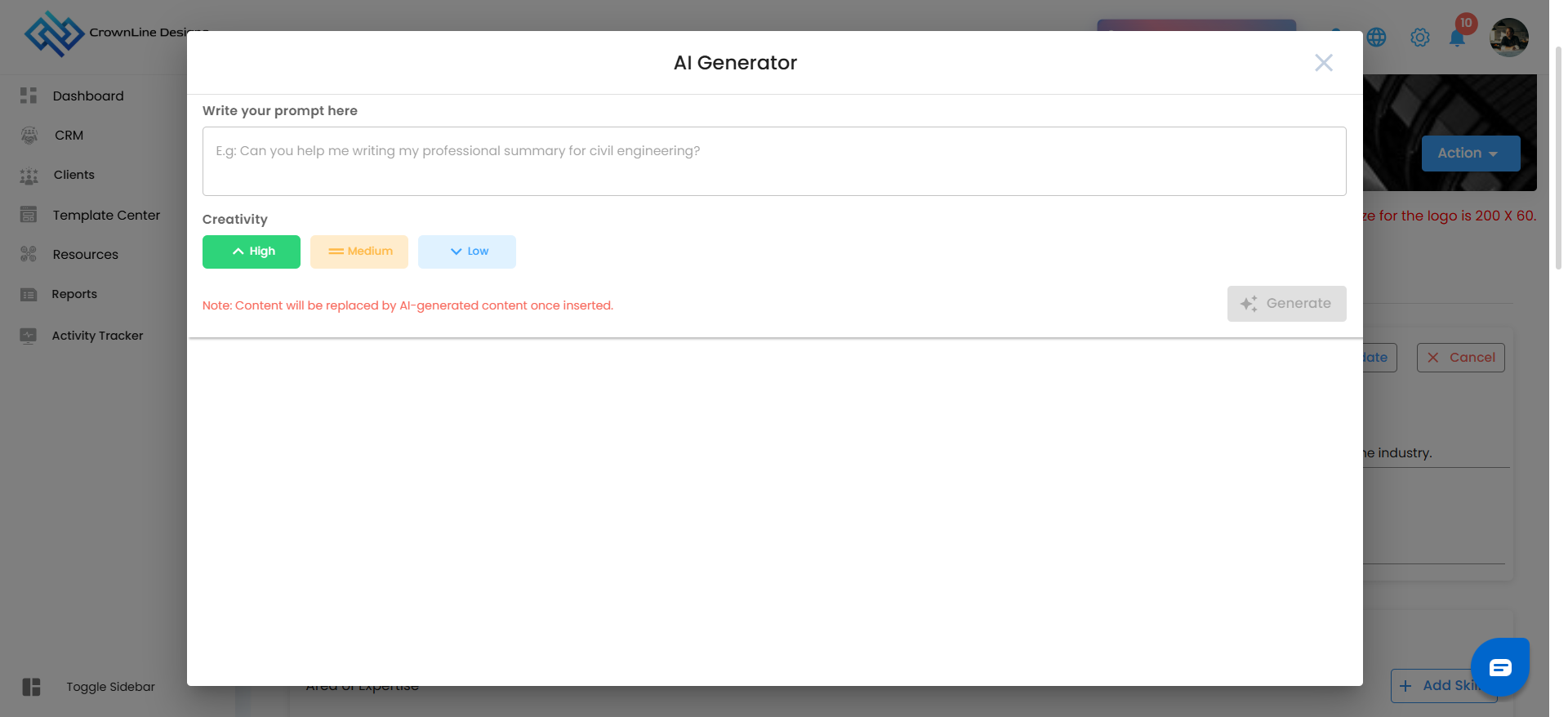 - Select the level of creativity (High, Medium, or Low) to control the tone and style of the generated content.