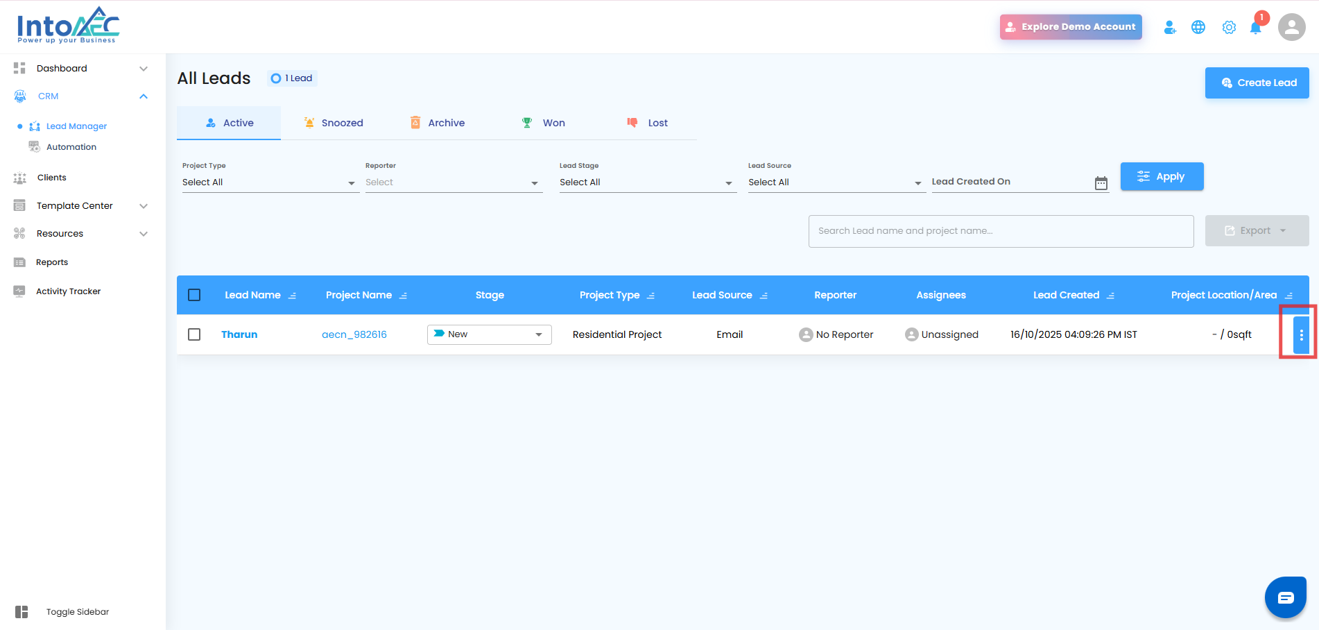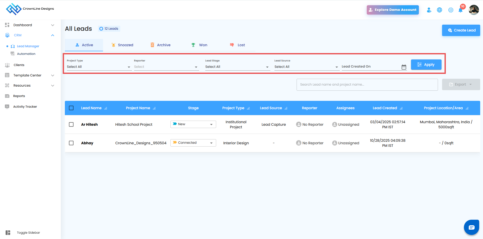By default, only Active Leads are displayed. Each lead is presented in a clean, structured layout, giving you instant insight into its status. You can also search or filter to locate specific leads quickly.