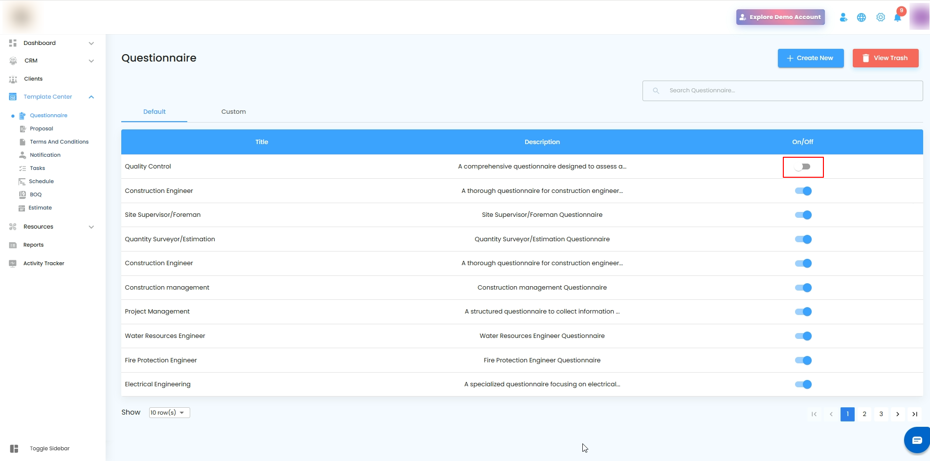 - Show – When enabled in the Template Center, your questionnaire appears as an option during the discovery phase, ready to be sent to leads instantly.