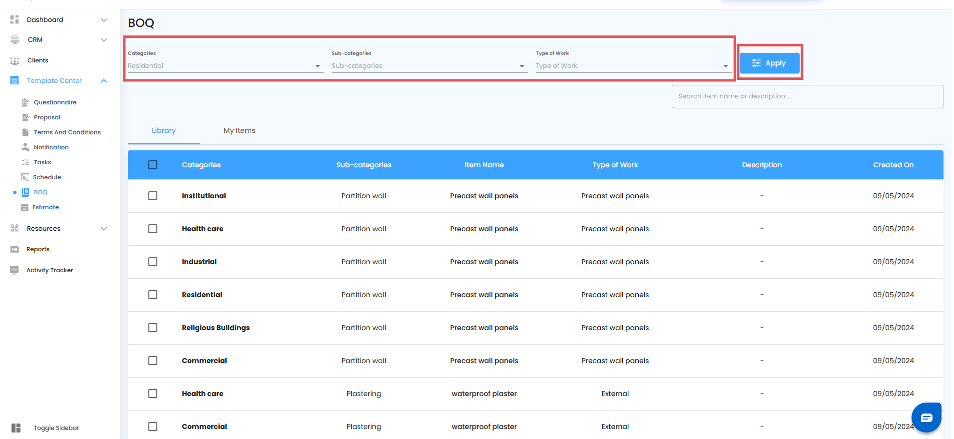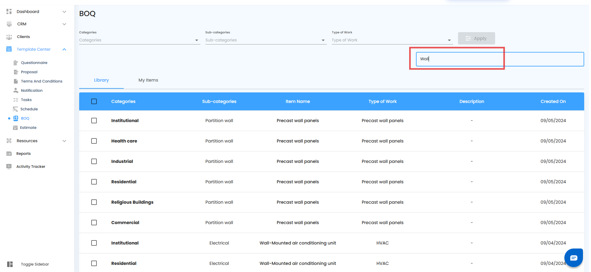 Combine multiple filters (Category, Sub-Category, and Type of Work) to get highly targeted results. This helps you find the right items quickly and ensures your BoQ stays accurate and well-organized.