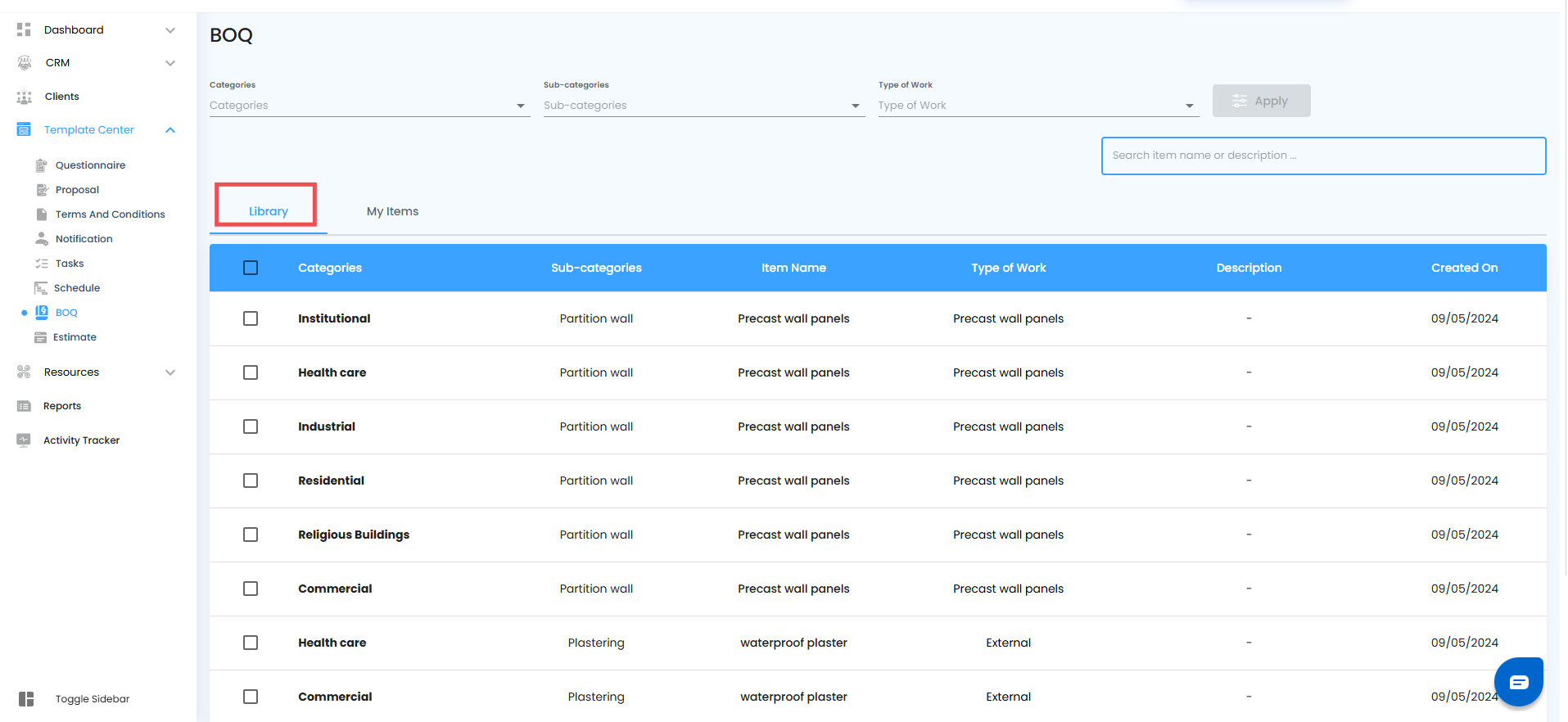 The Library makes it easy to find and manage items for your project. With structured filters and a clean search layout, you can quickly locate the right materials, tasks, or components for your Bill of Quantities (BoQ) — without spending time scrolling through long lists.