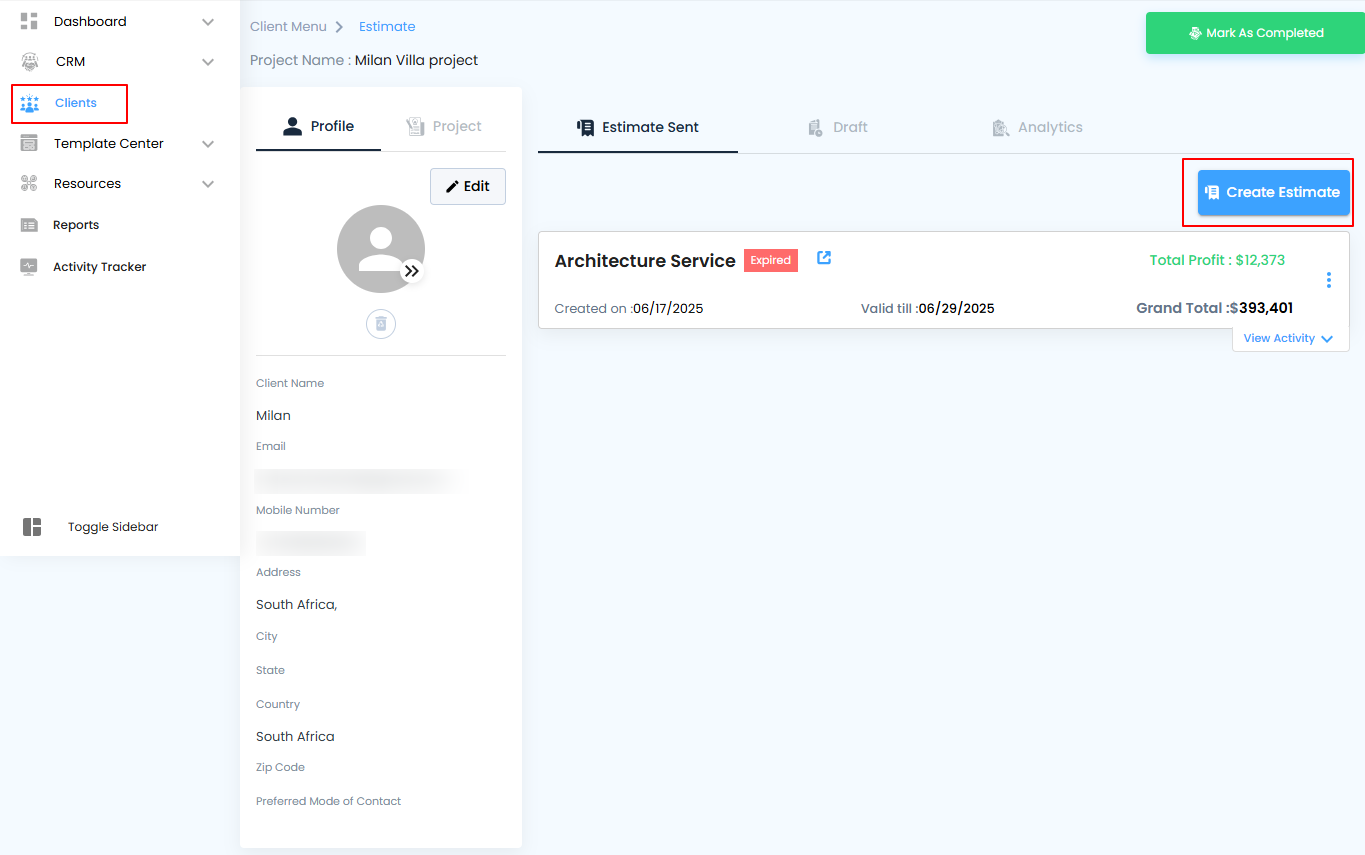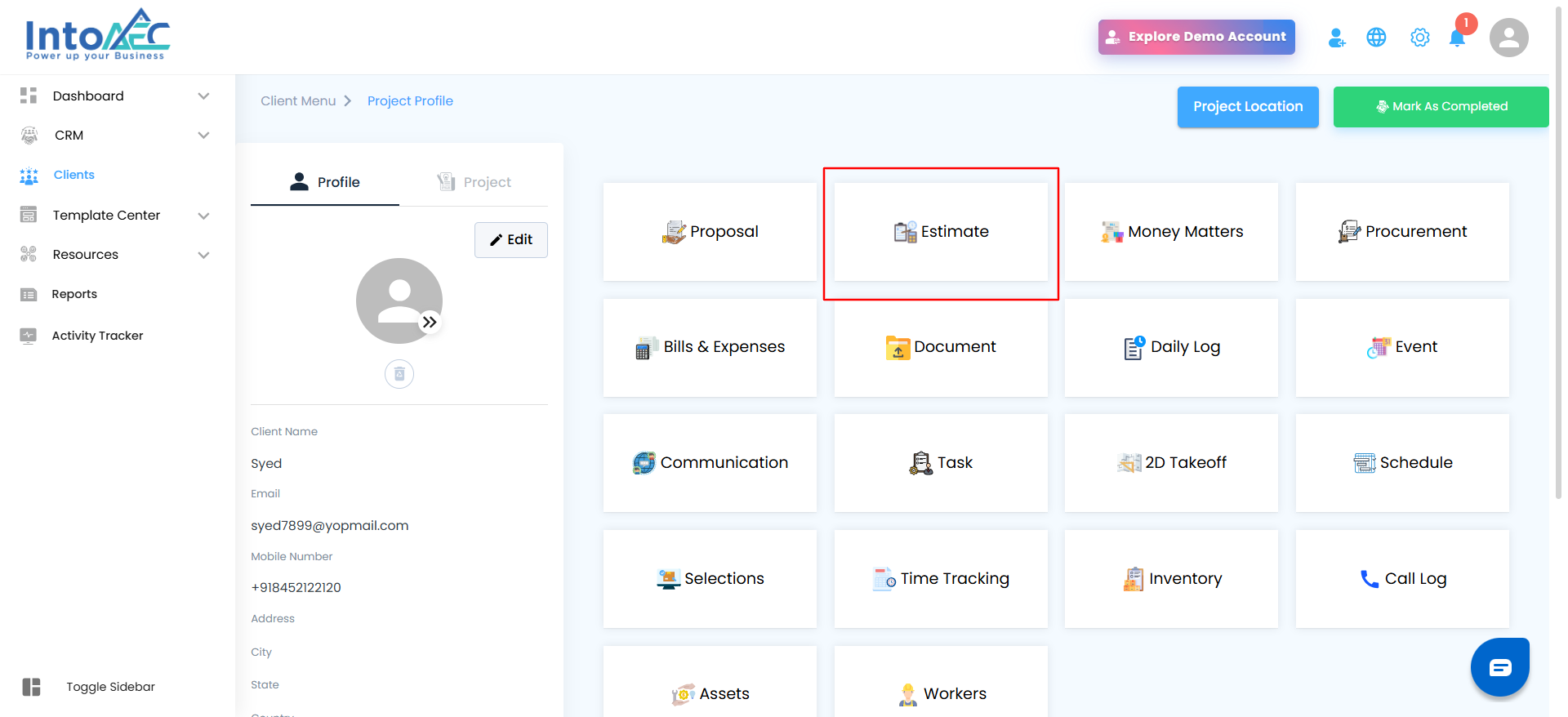The client’s name, email, and contact number are also auto-filled to ensure consistency and accuracy.