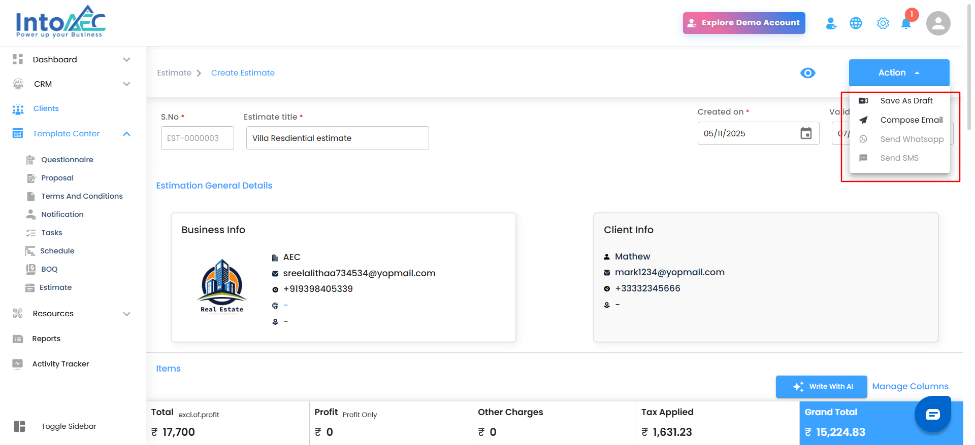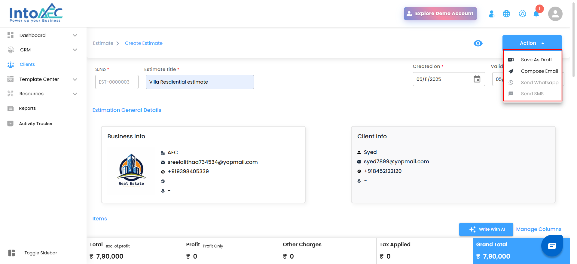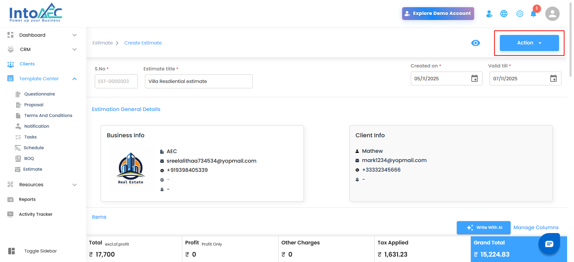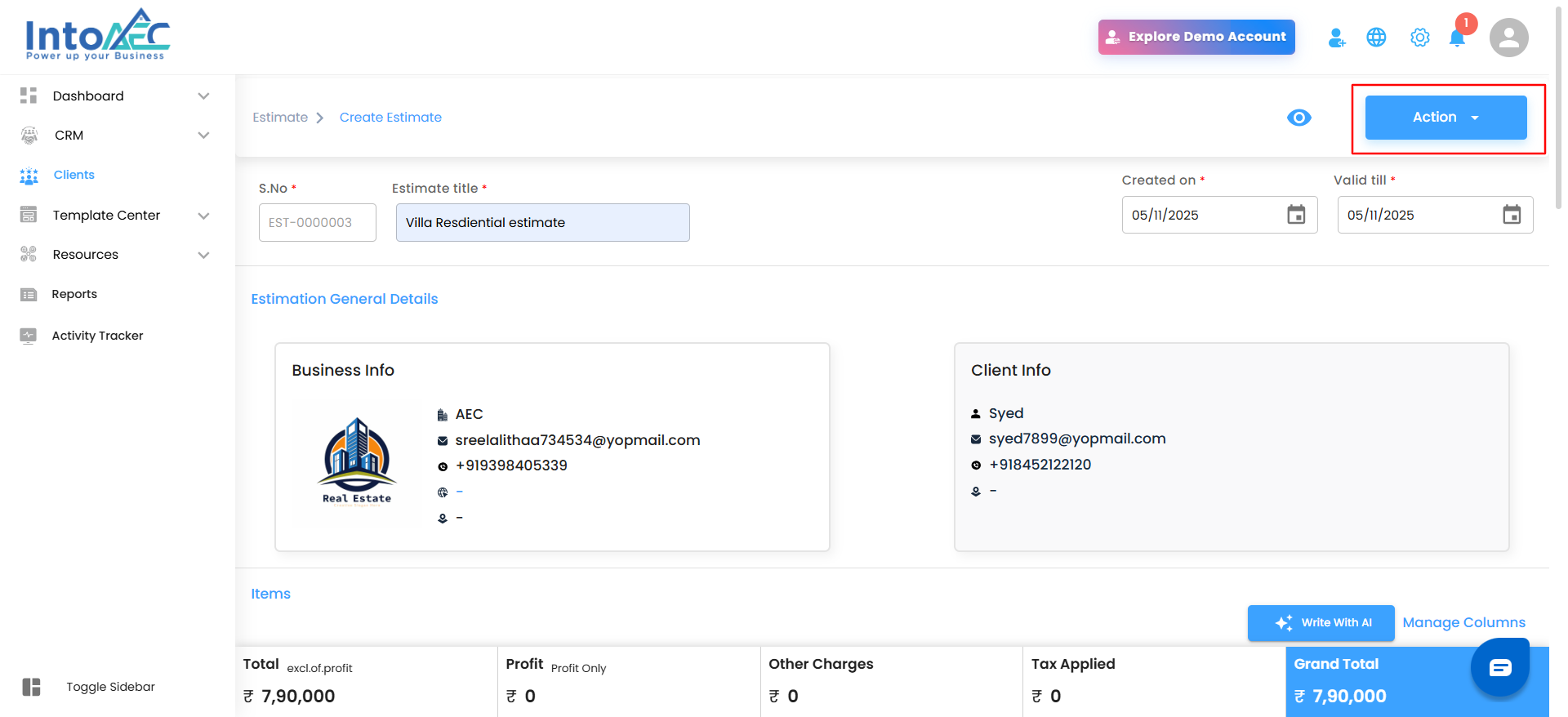 After completing all the previous steps — from adding items to applying taxes and discounts — you’re ready to finalize your estimate. The Action button gives you multiple ways to share or save your estimate based on your workflow and client preferences.