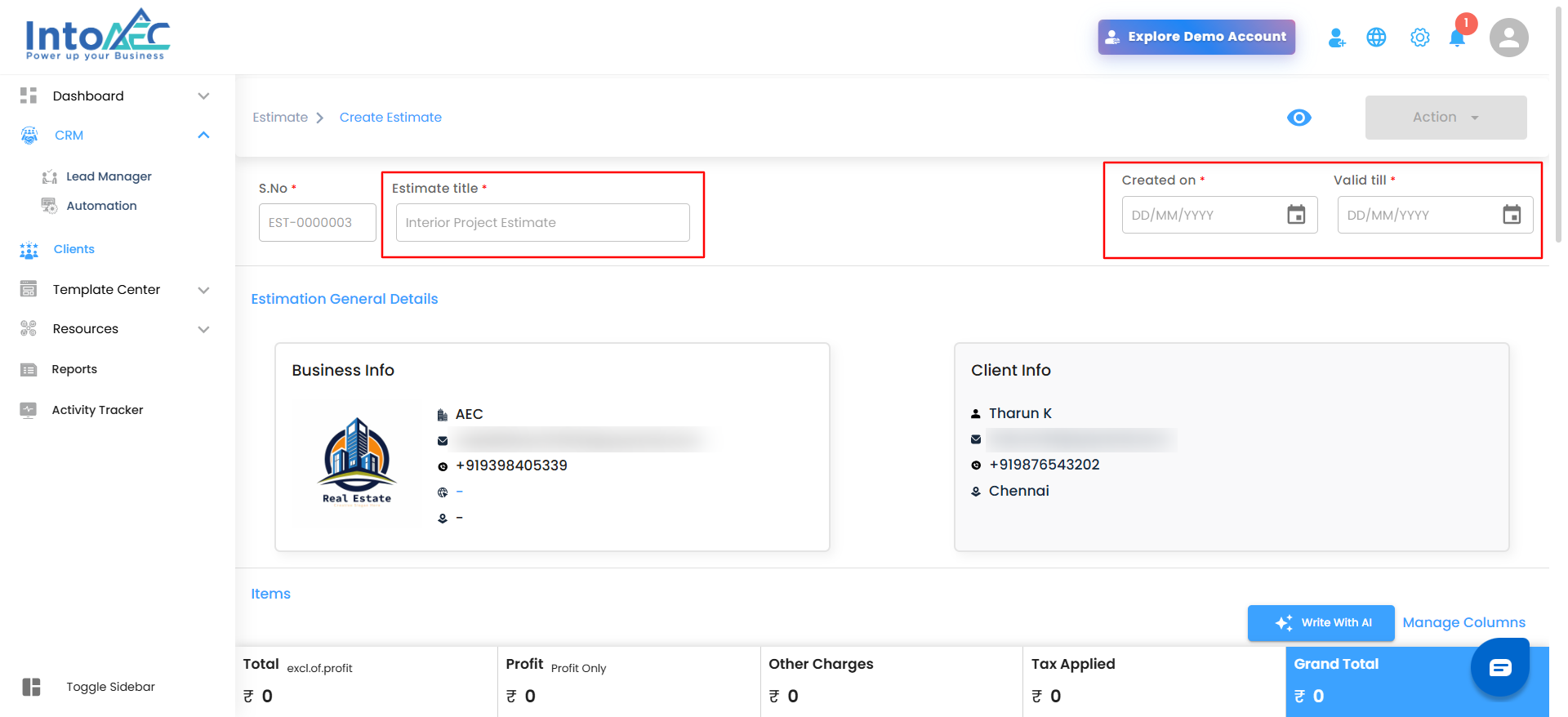 Created On / Valid Till – Define the estimate’s active period for clear timelines and accountability.