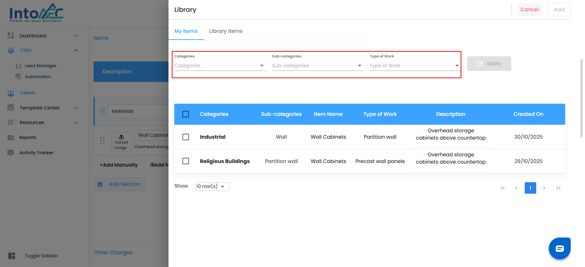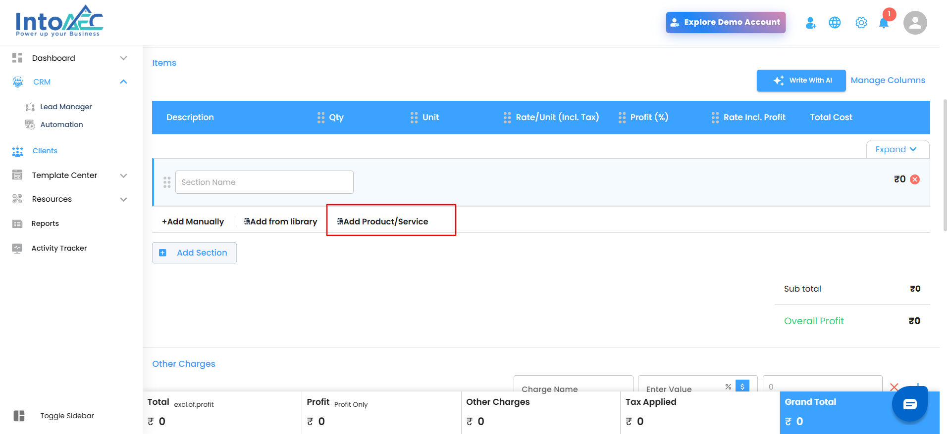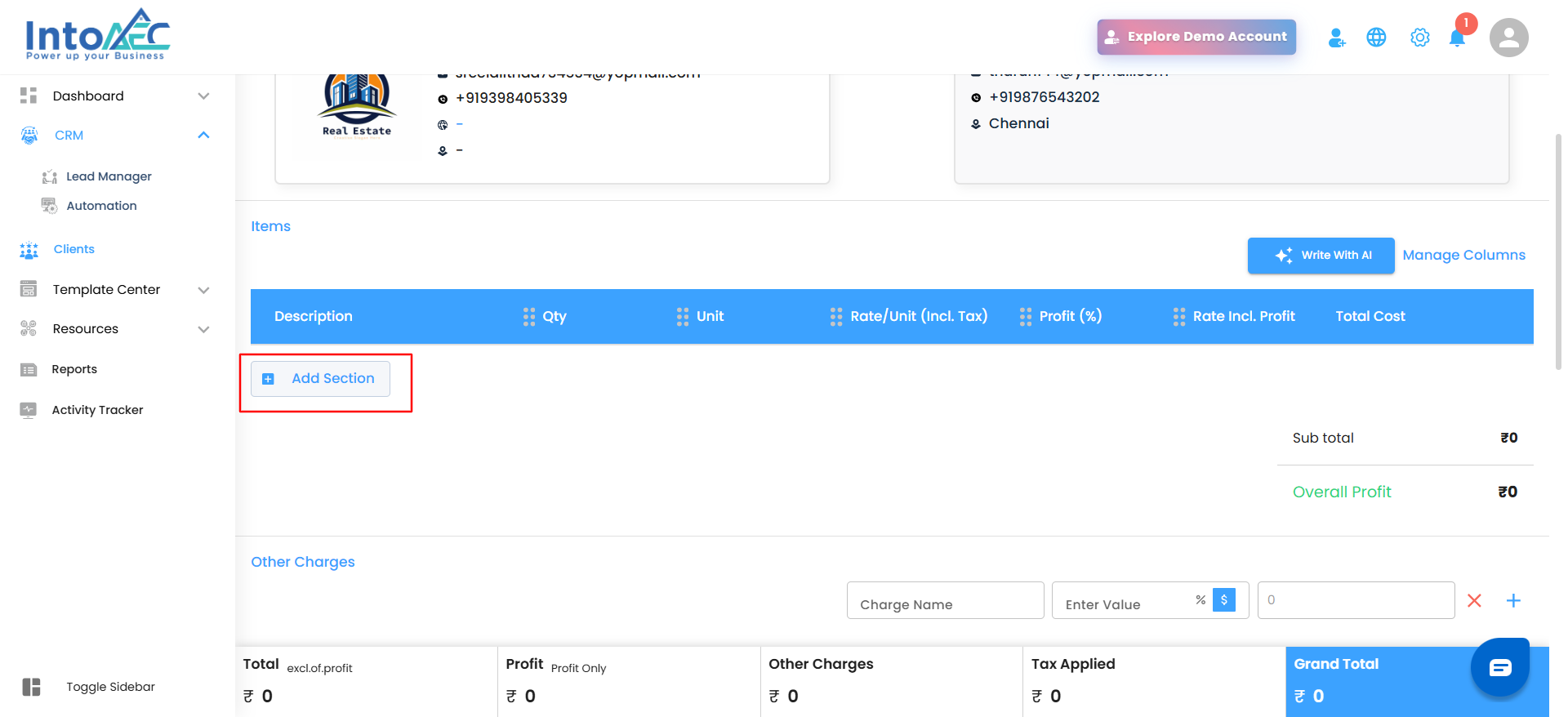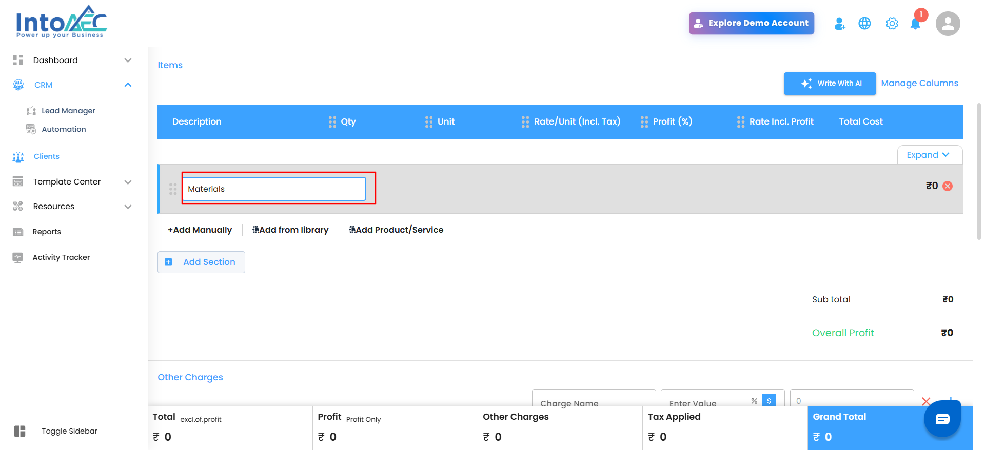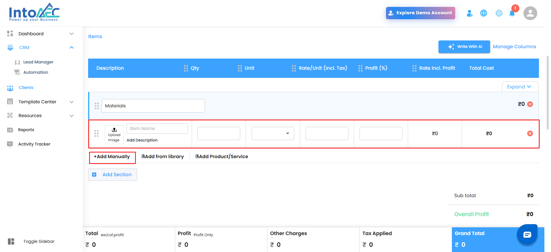 Your chosen items now appear under the section with all their pre-filled details—description, quantity, unit, rate (incl. tax), profit %, and total cost.