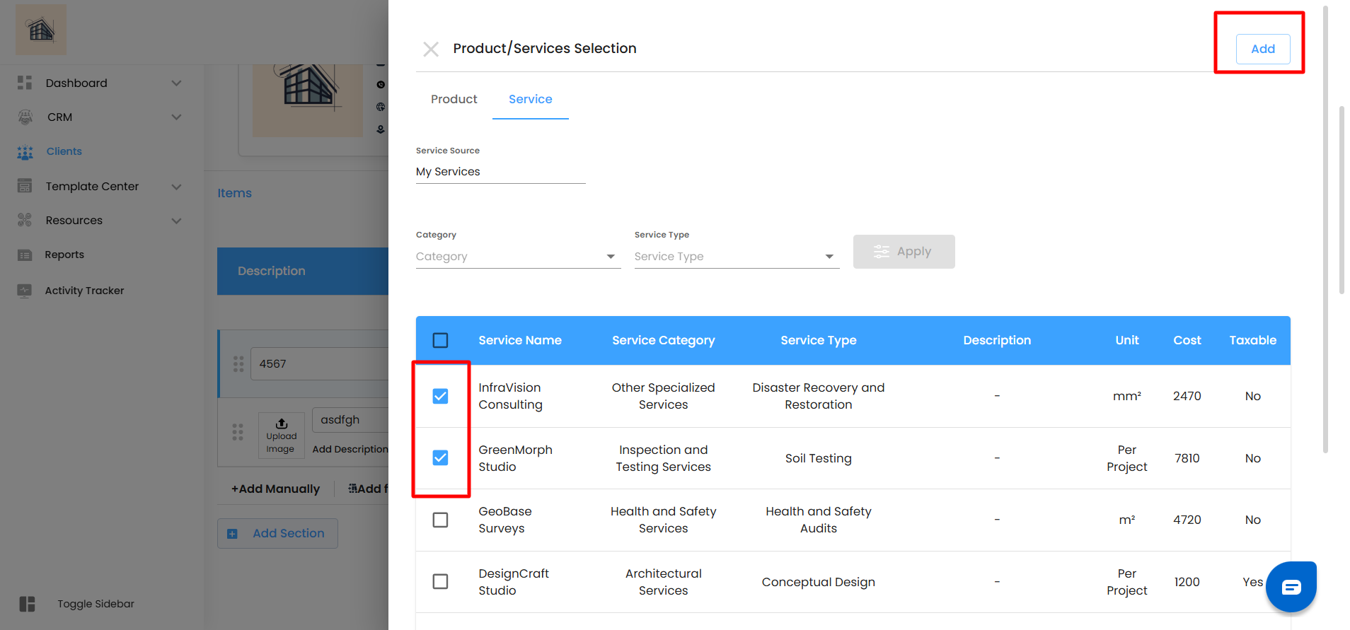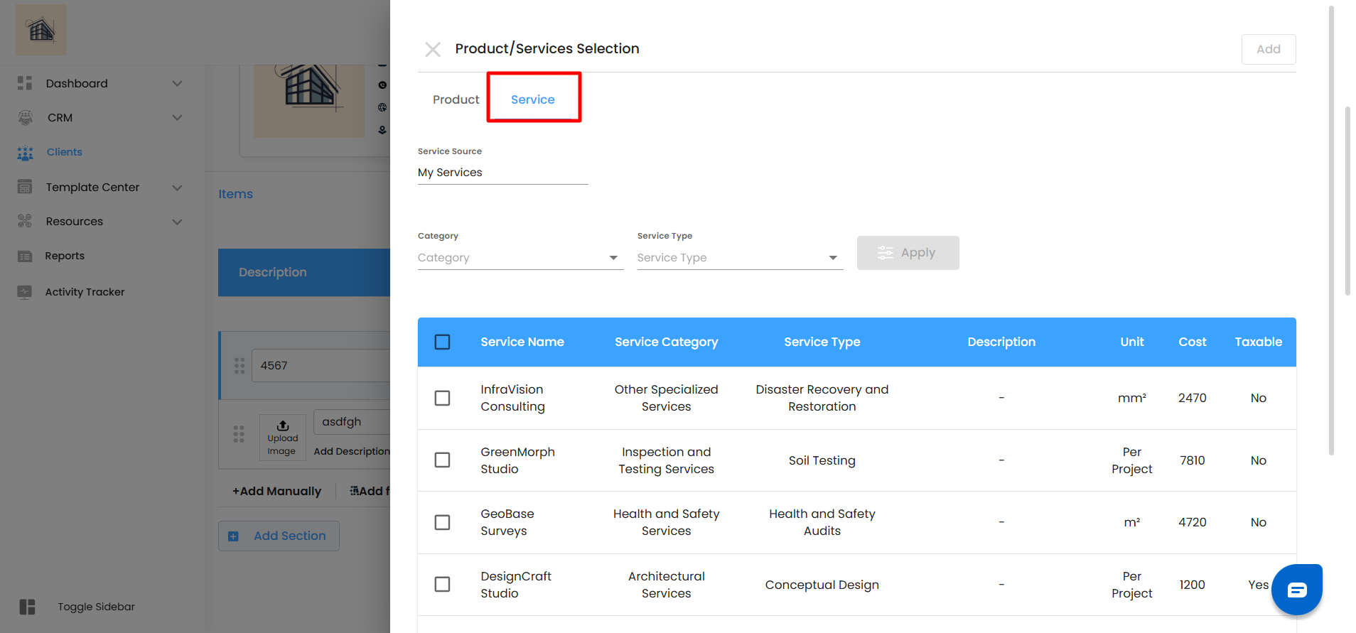 - Service – Displays available services from your inventory, showing Service Category, Service Type, Unit, Cost, and Taxable Status.