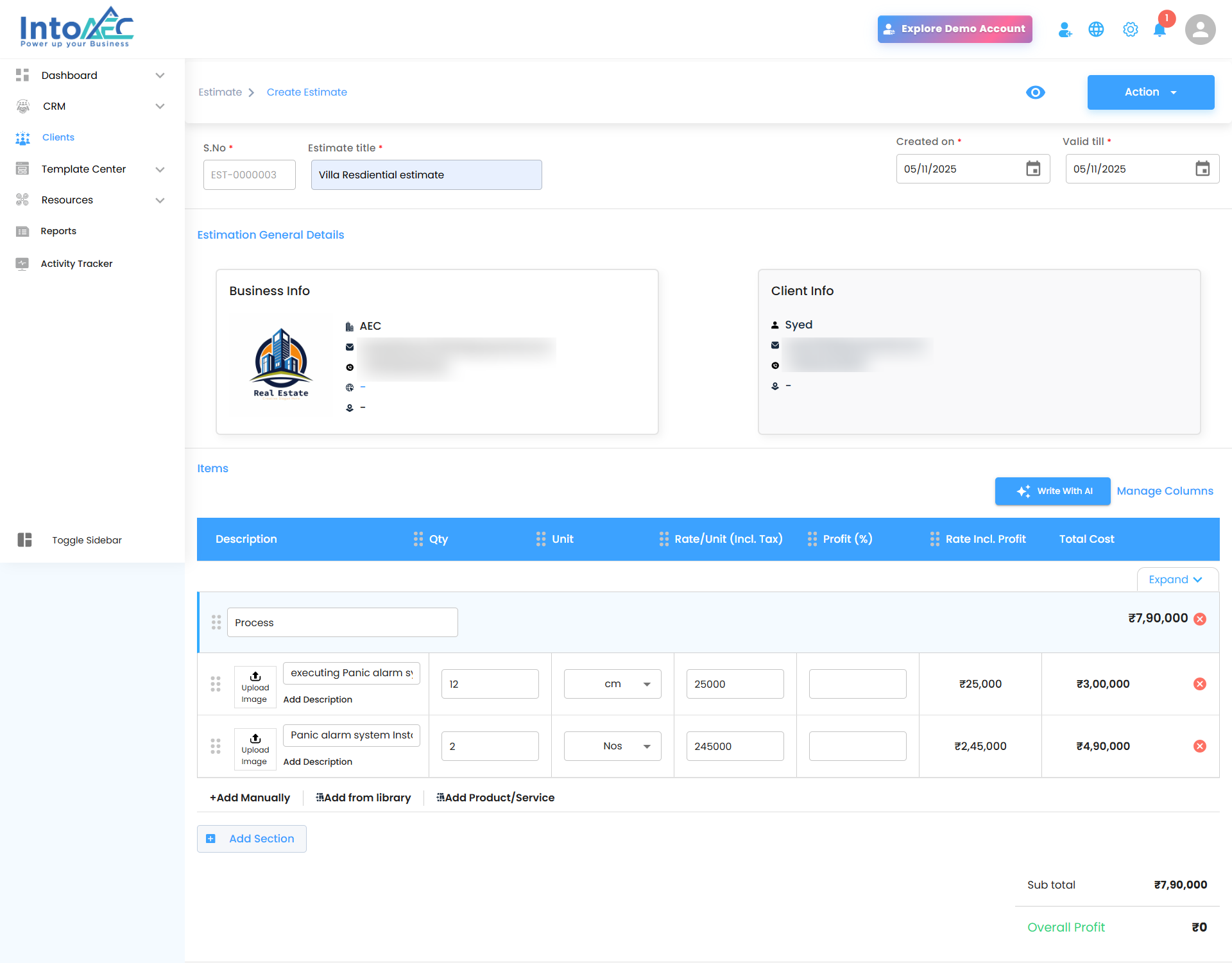 With templates: You’ll get a structured, ready-to-use estimate prefilled with standard sections just customize and send.