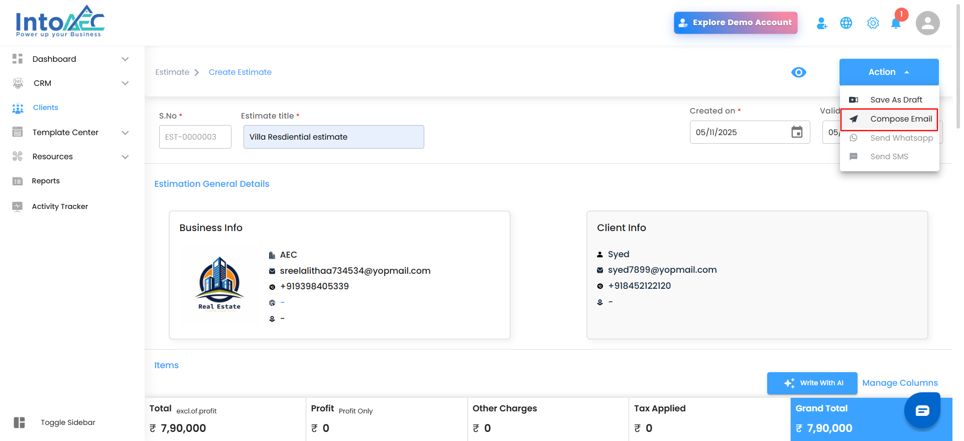 Compose Email – Open the built-in email window to send the estimate directly to your client’s inbox.