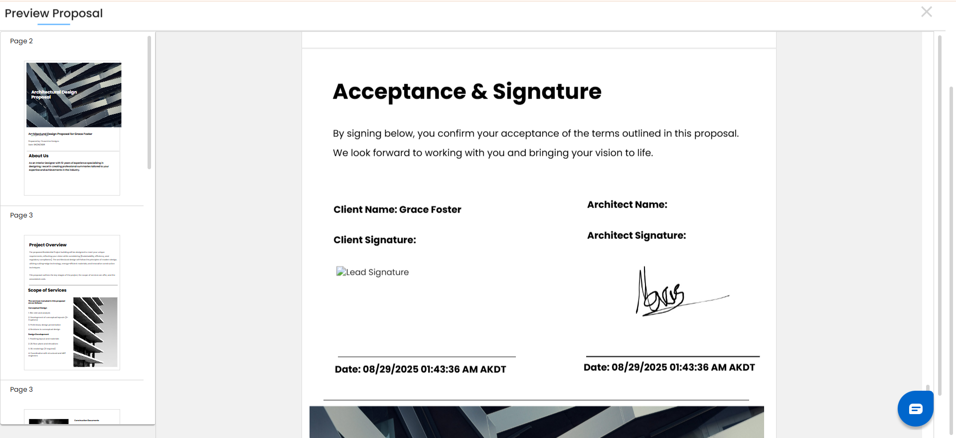 - After reviewing and signing, the client clicks the Accept Proposal button to finalize their approval.