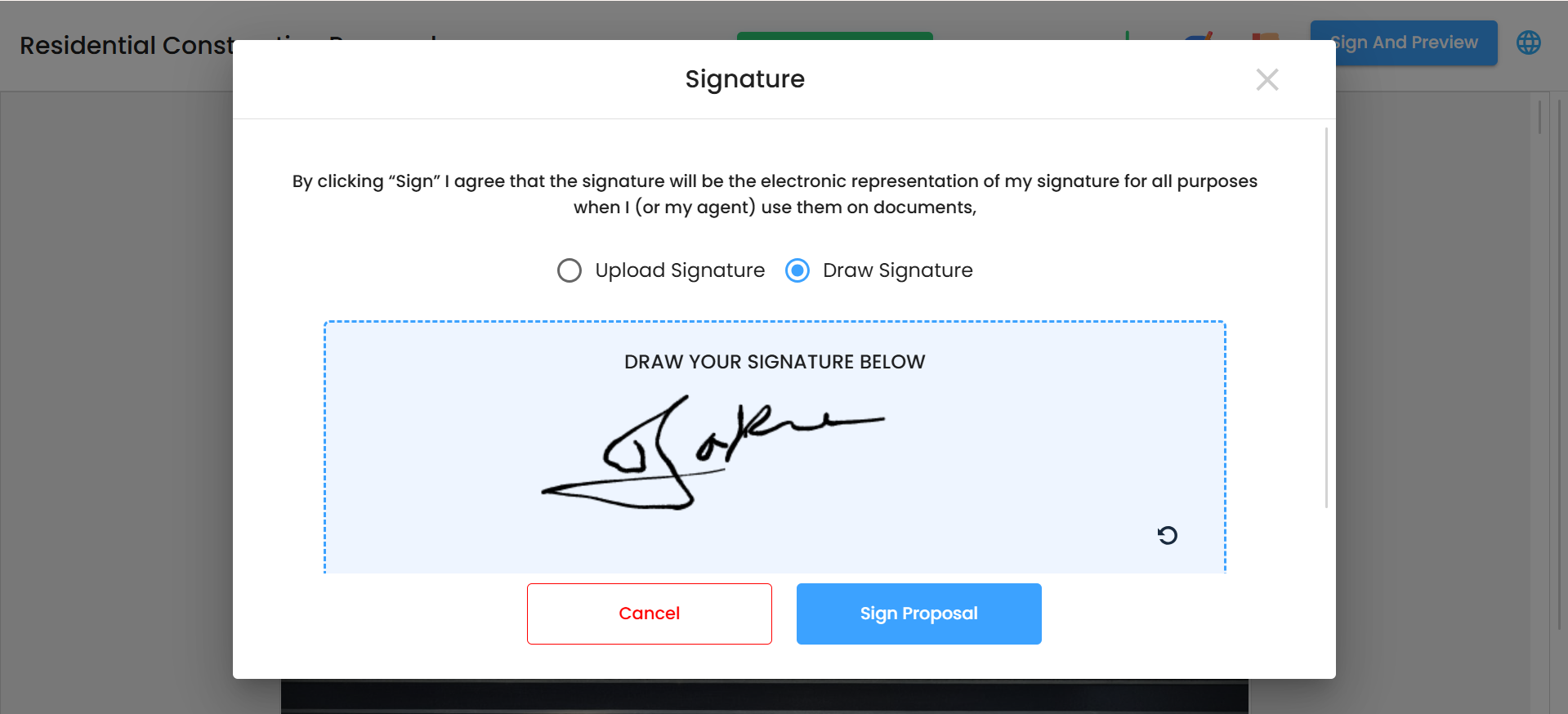 - The client can upload or draw their signature on the proposal.