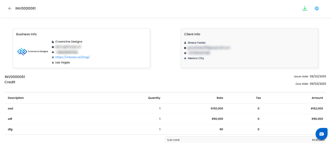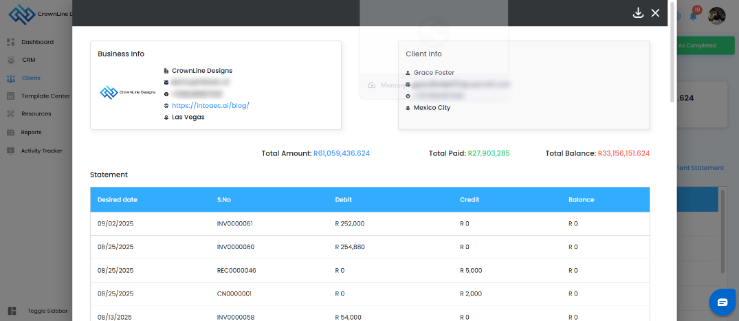 • Drill Down → Click on any Invoice, Credit Note, or Receipt entry to open full details — and yes, you can download the document instantly.