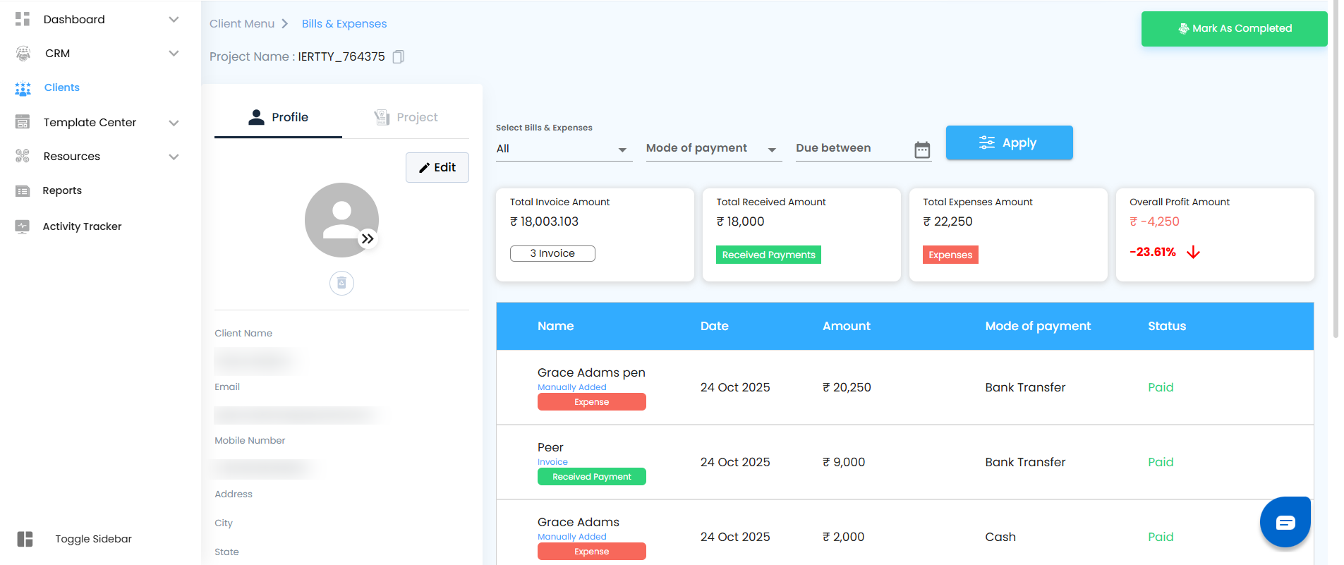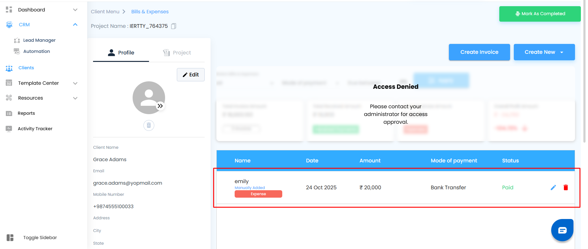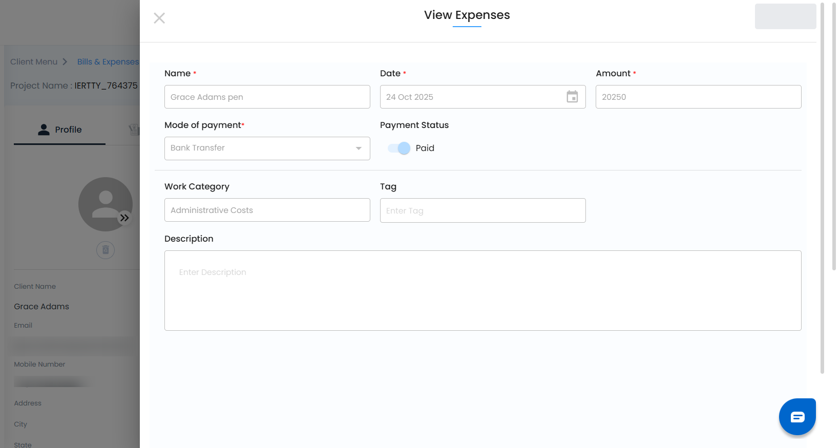 - Hit Save and your expense is instantly recorded. It appears right under Bills and Expenses for that client—organized, visible, and ready whenever you need to review it.