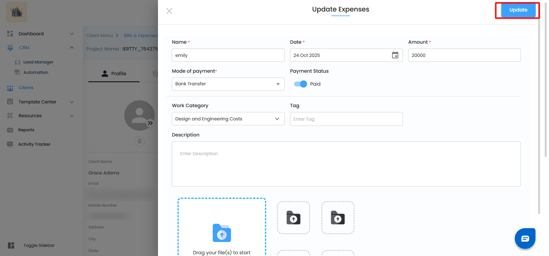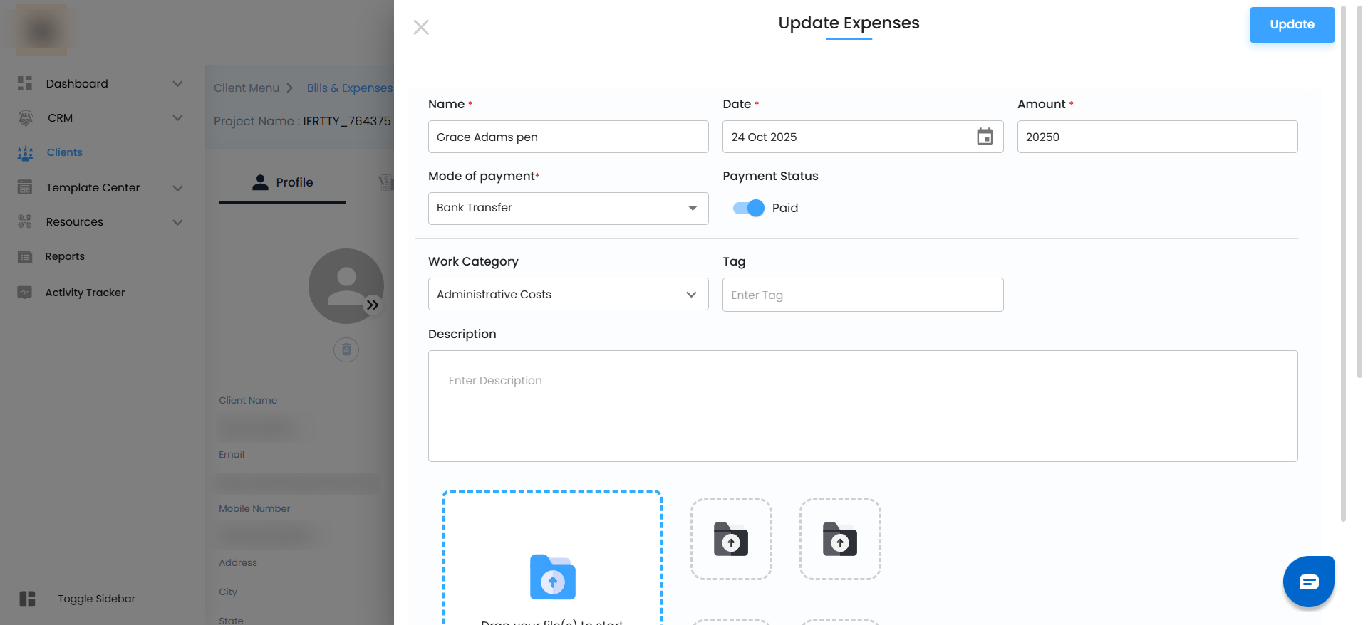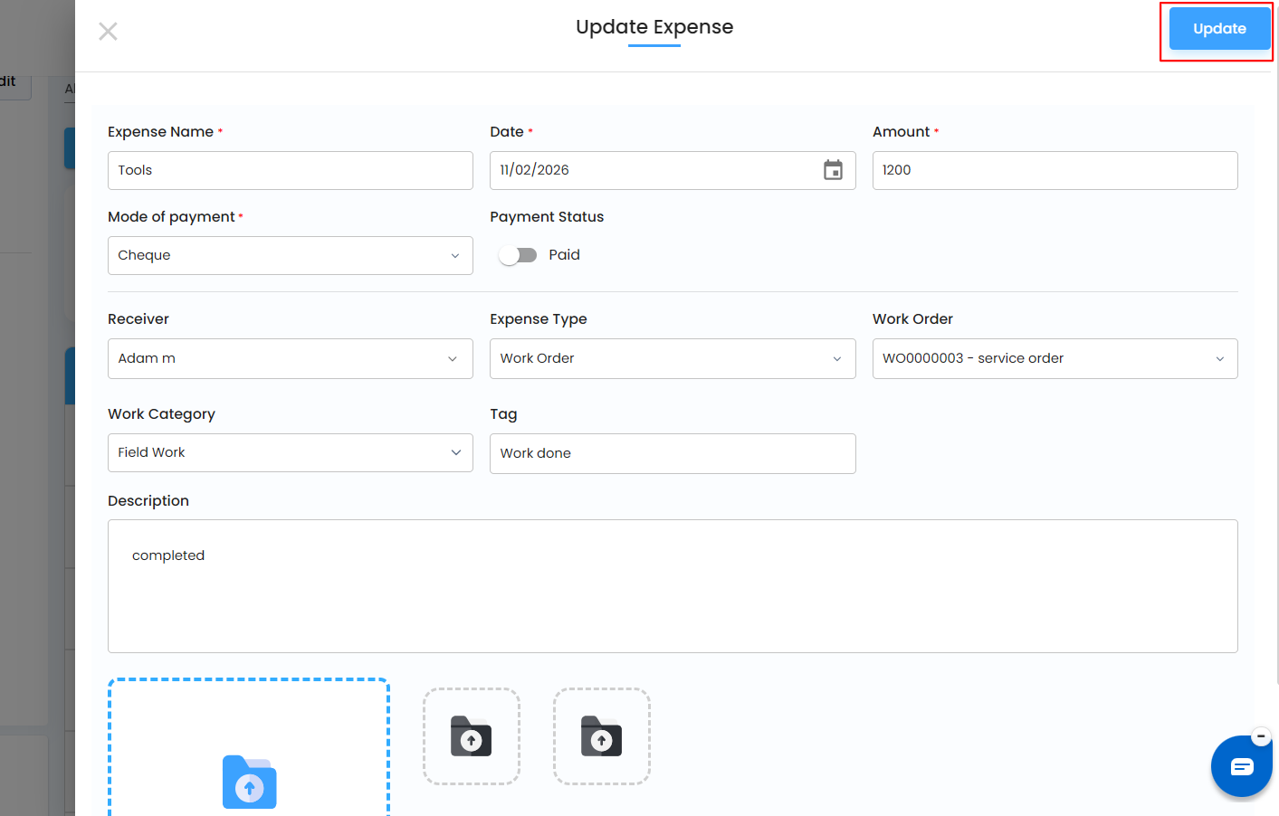 - Update the allowed fields — Name, Date, Amount, Payment Mode, Work Category, Tag, Description, and File Upload — as needed.
