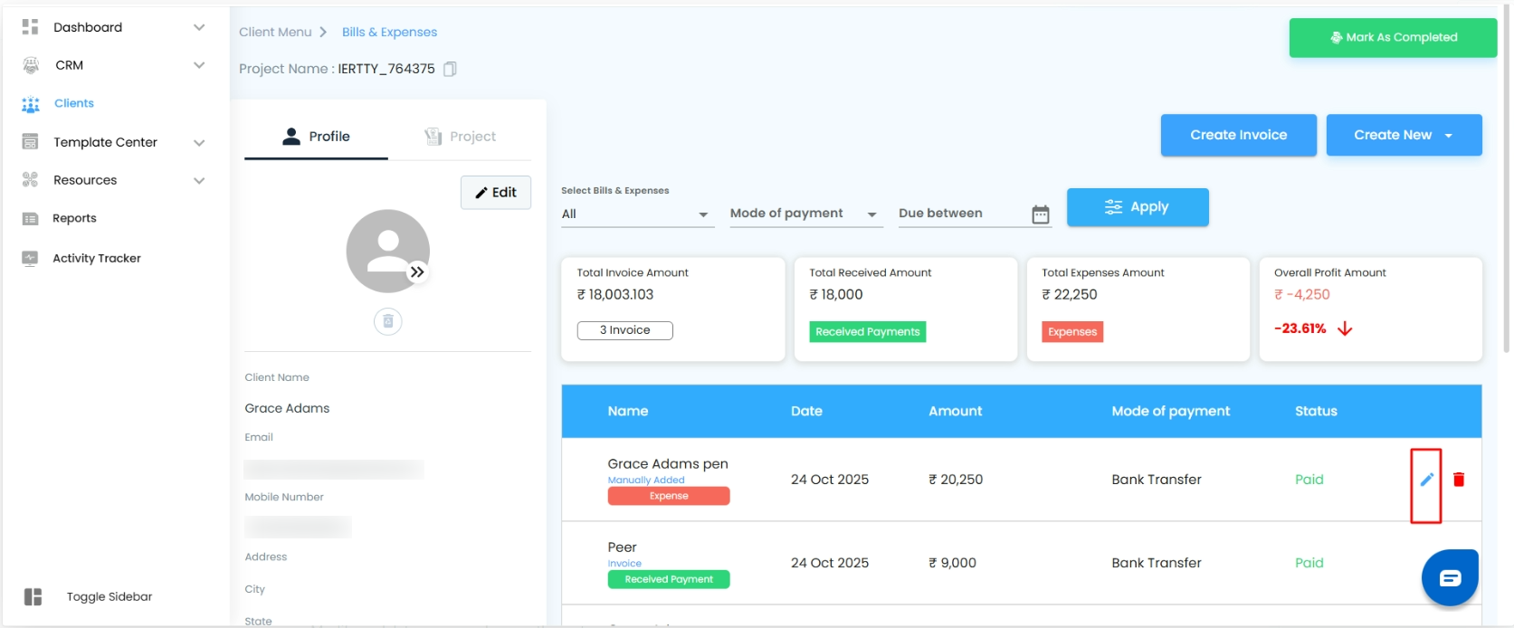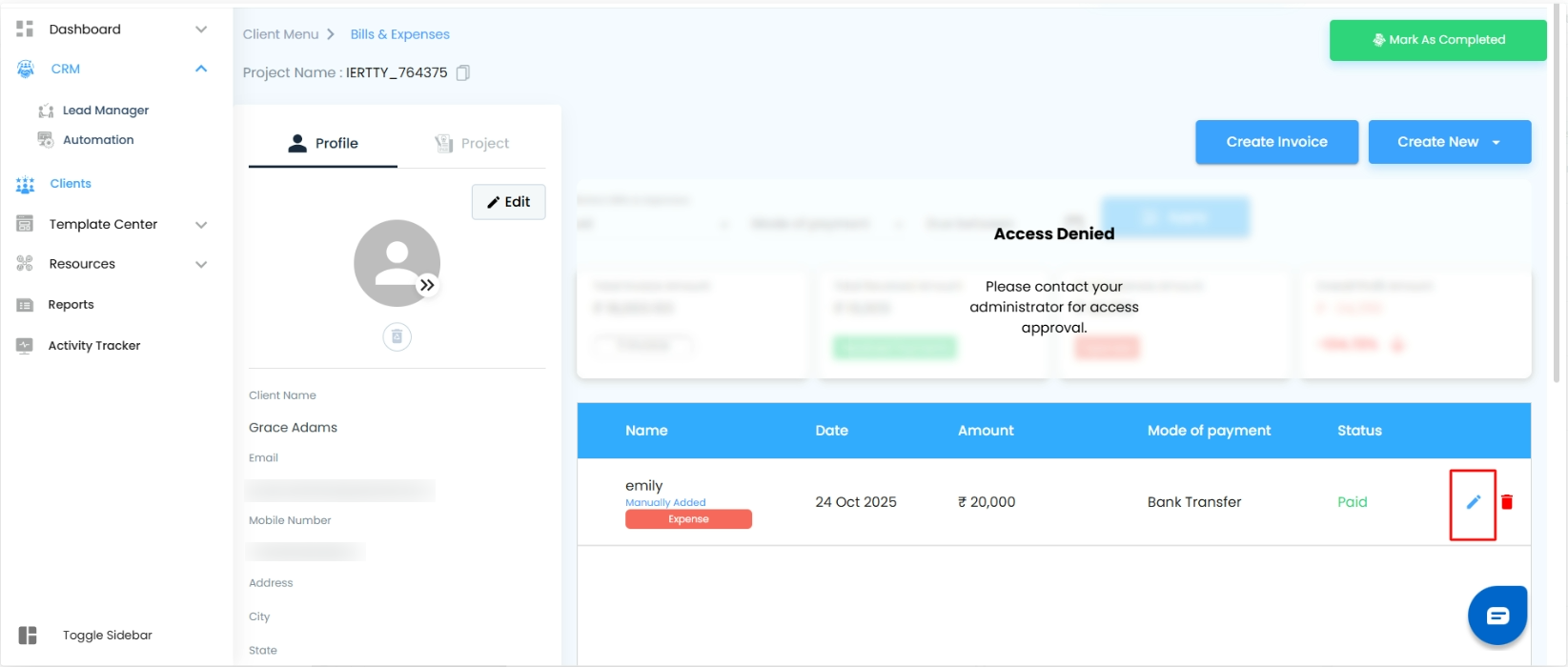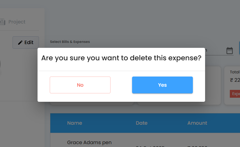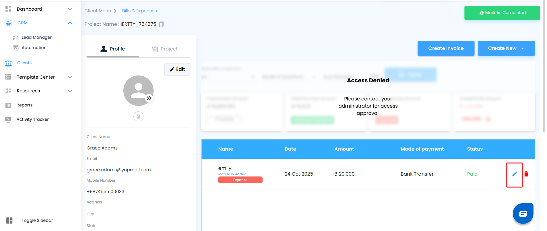 Clicking the Edit Pen Icon beside an expense allows authorized users to update or manage expense details. The edit functionality depends on the user’s access level — All Access, Write Only, or Read Only.