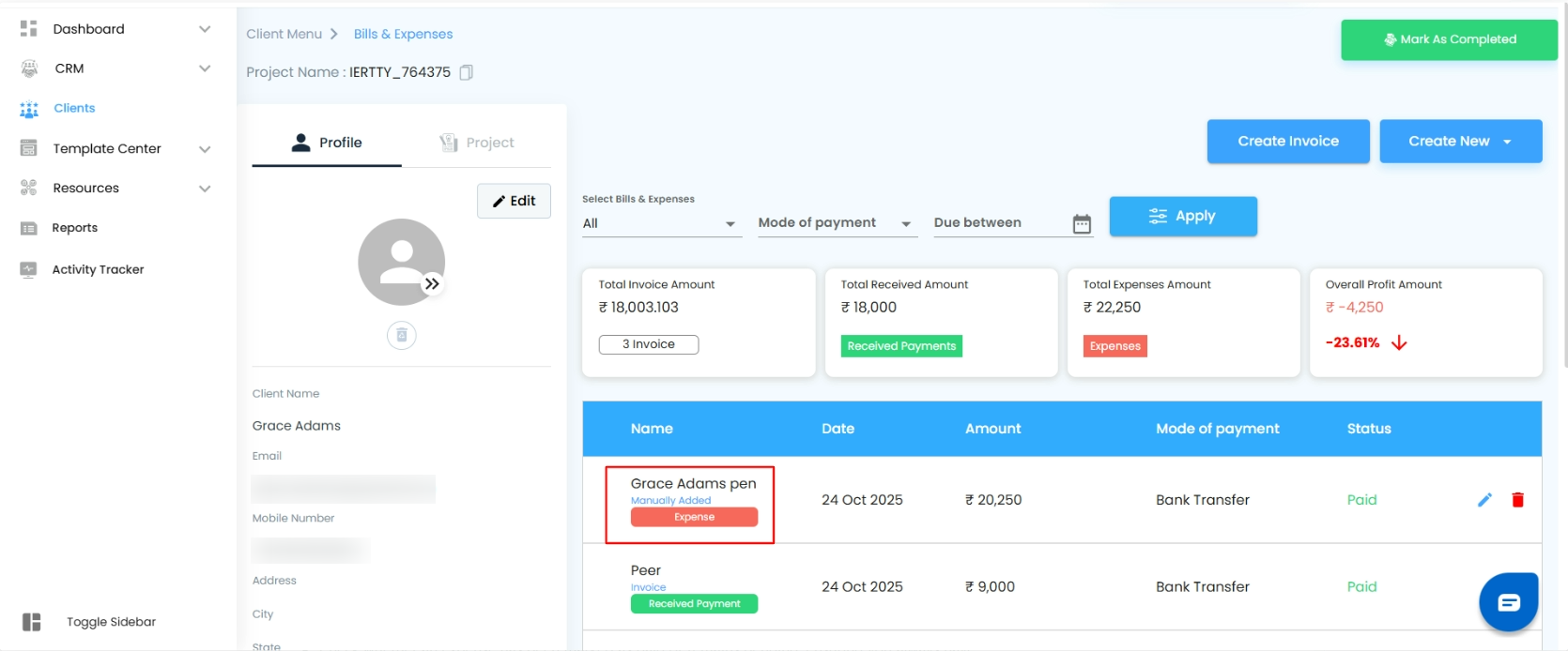 - When it’s time to log a new cost, just hit Create New and choose Expenses from the menu. In a few clicks, your expense is ready to be recorded, keeping your financial records clean and up to date.