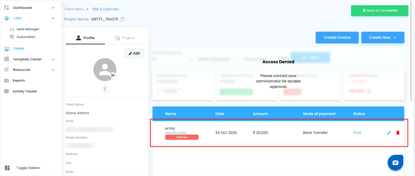 If a Write Only user attempts to click the edit icon for an expense created by another user, an Access Denied message will appear, indicating restricted permissions.