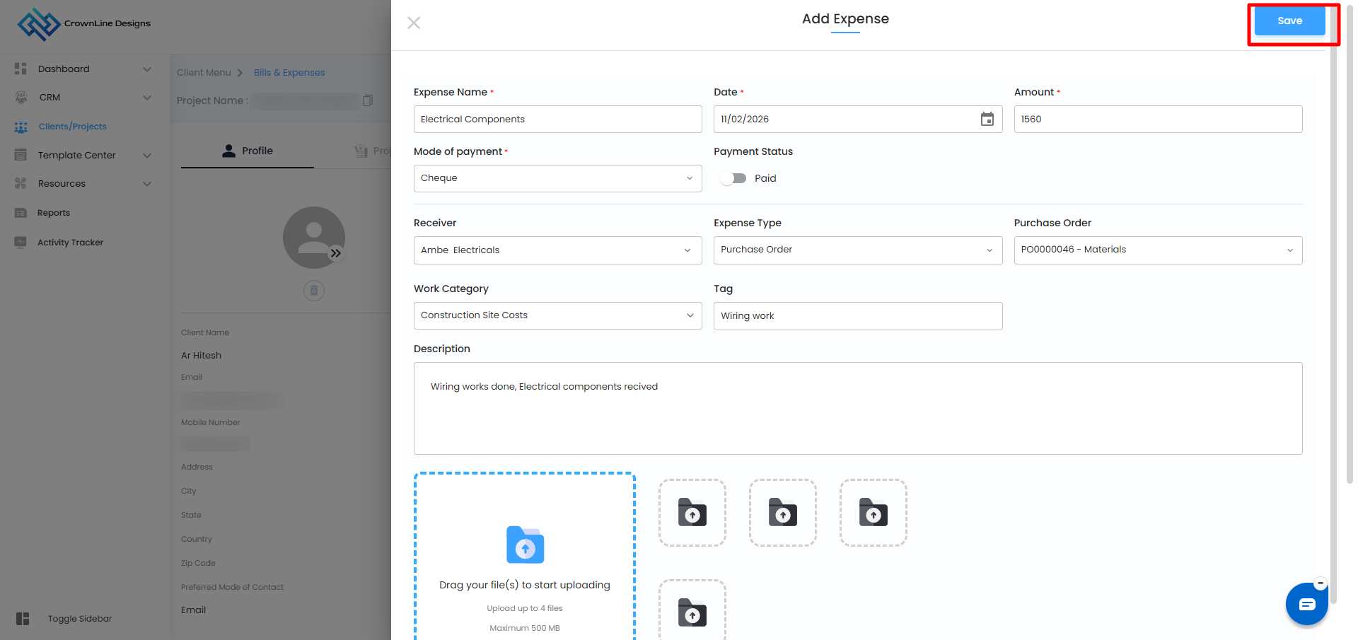 The moment you save, the expense is automatically added to the Bills and Expenses section -keeping every financial detail organized, accessible, and ready whenever you need it.