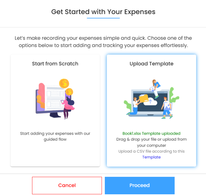 Once you select Expenses, a pop up Get started with your Expenses appears on screen.You have two options Start from Scratch and Upload Template.