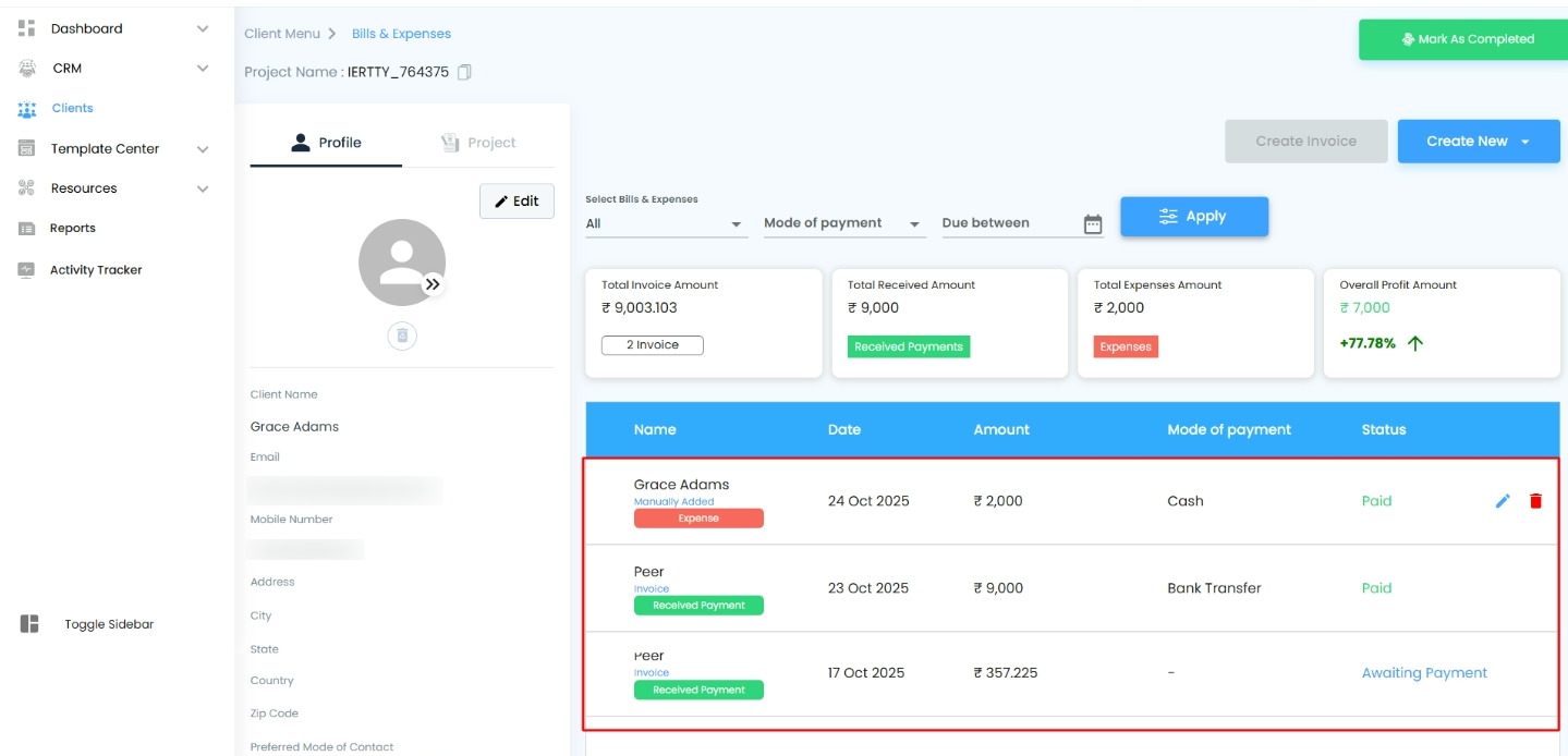 Calculates your project’s profit by comparing total income and total expenses. You can monitor profitability trends here to support better decision-making.