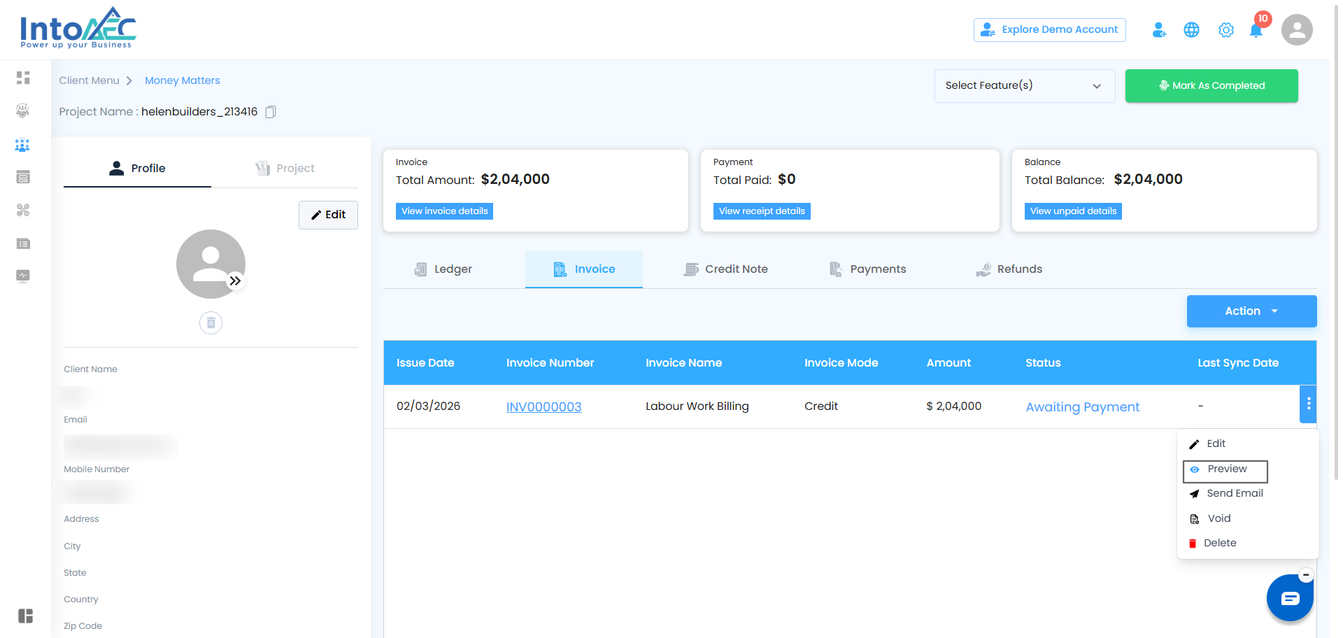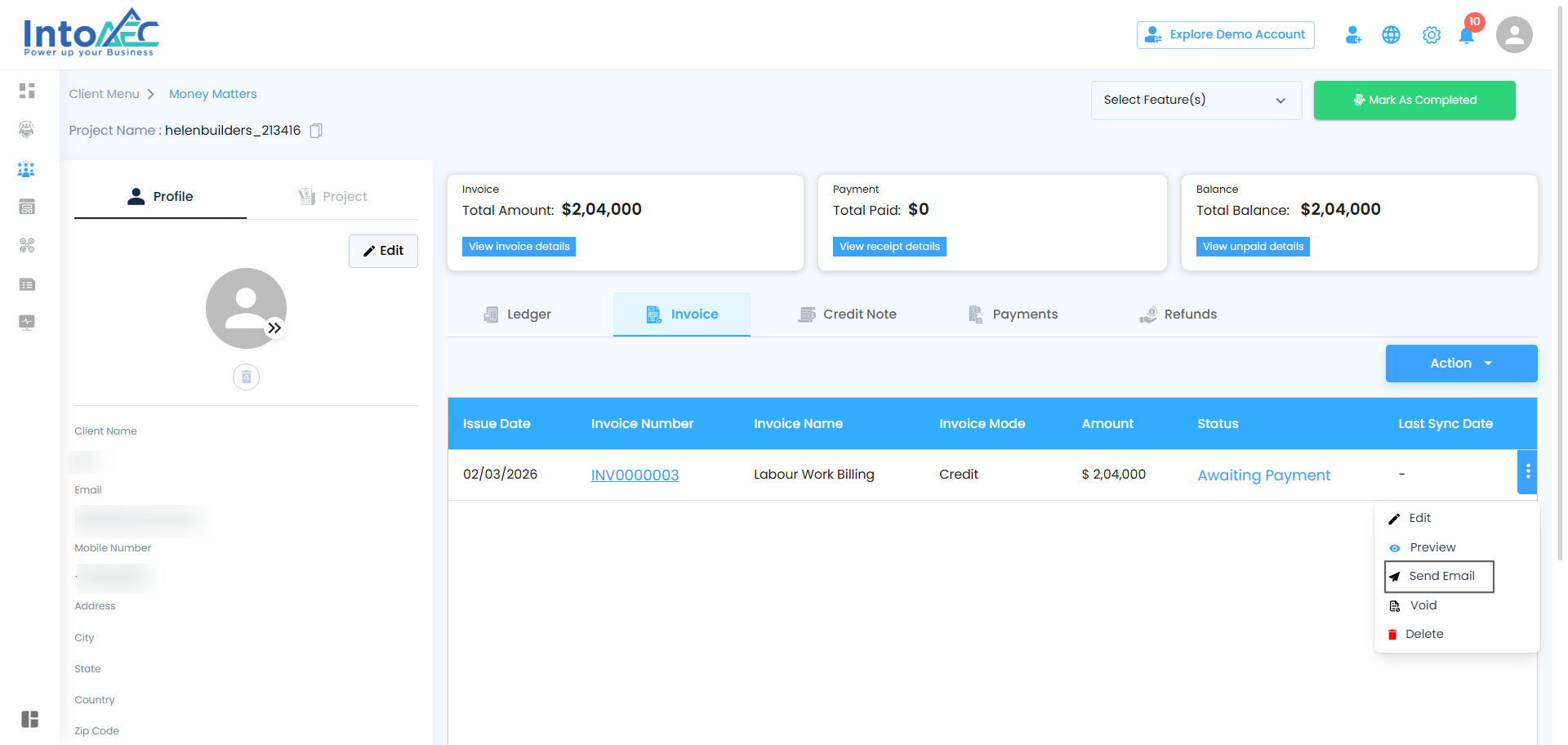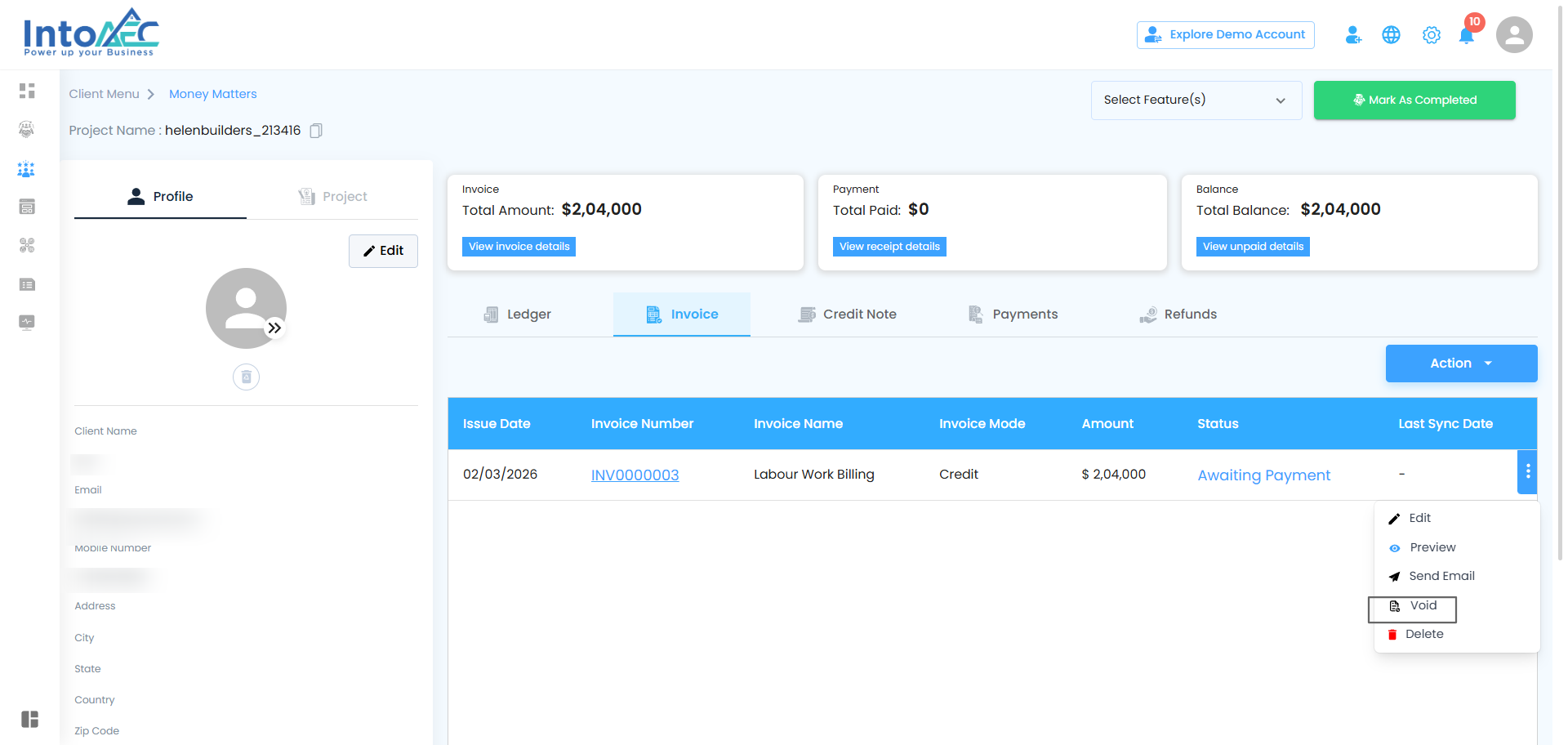 Once an invoice is created, IntoAEC gives you full control over managing it. From editing to sending or even voiding it, all actions are just a few clicks away. Here’s a breakdown of the possibilities:
