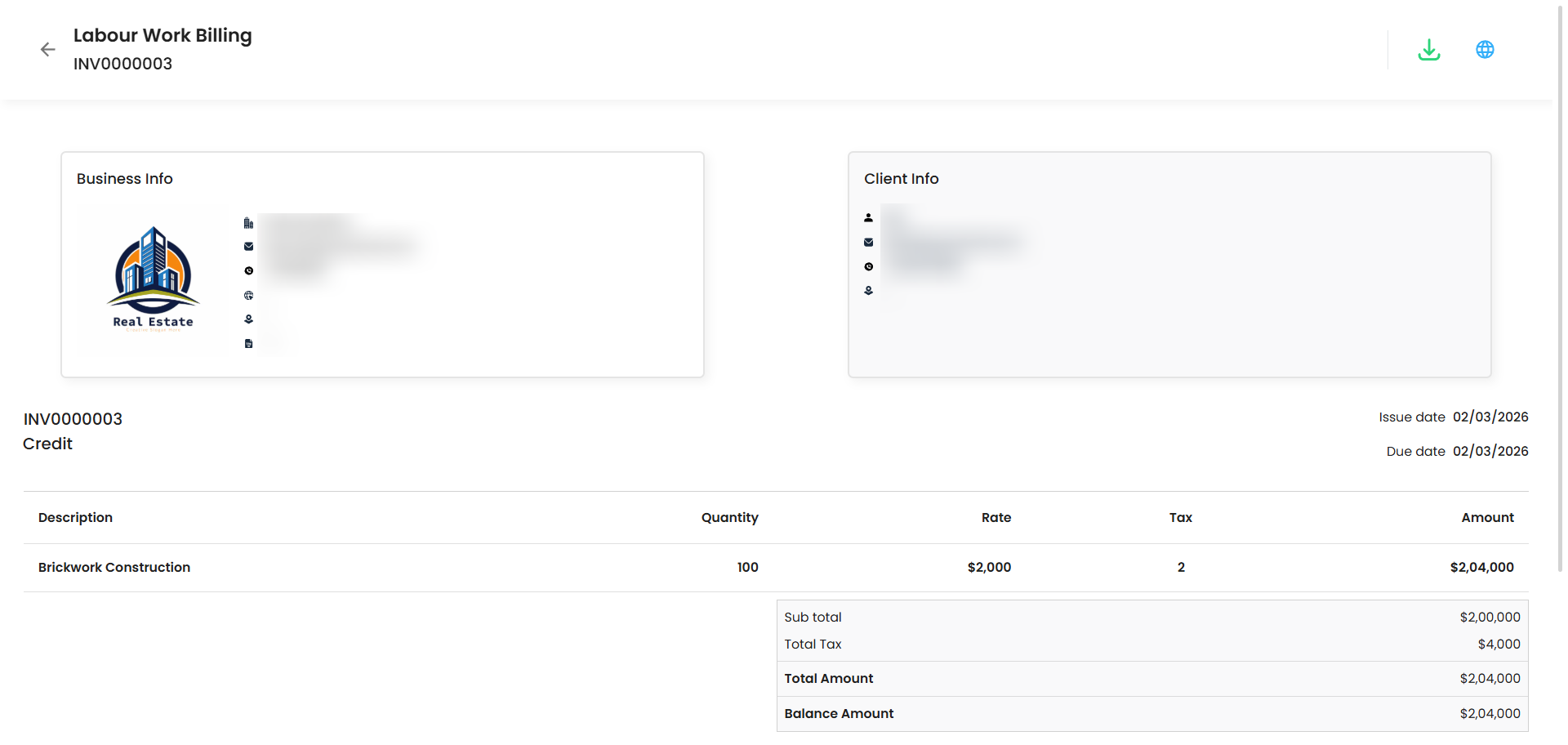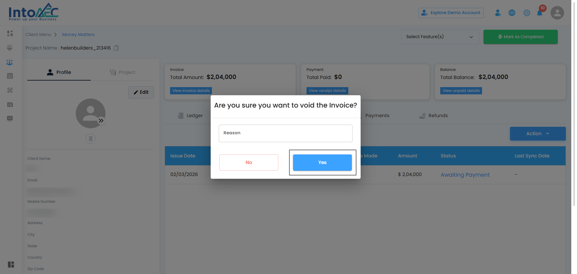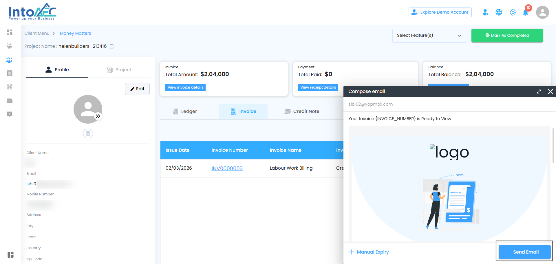 Once an invoice is created, IntoAEC gives you full control over managing it. From editing to sending or even voiding it, all actions are just a few clicks away. Here’s a breakdown of the possibilities:
