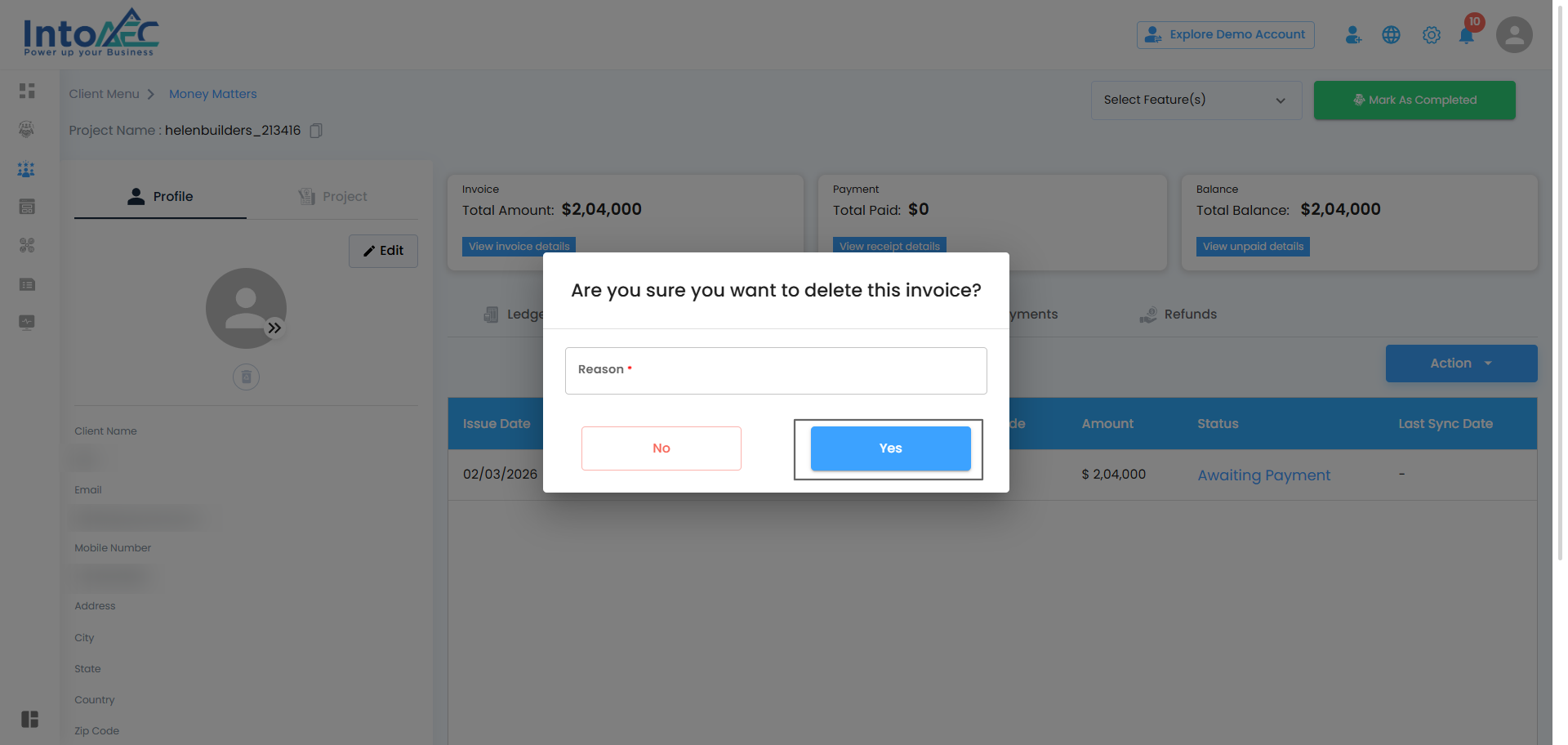 Enter the reason and click Yes → The invoice is permanently removed.