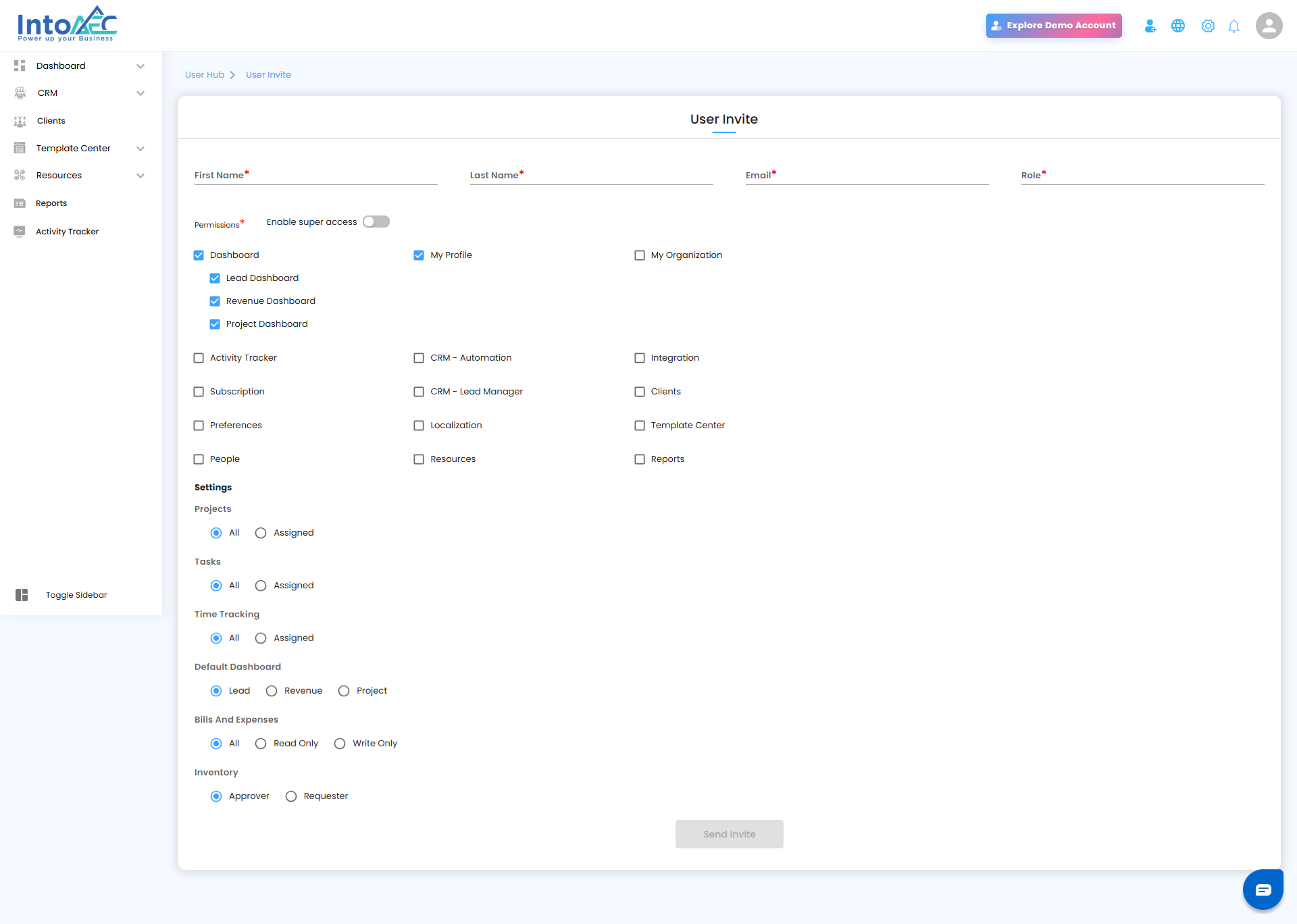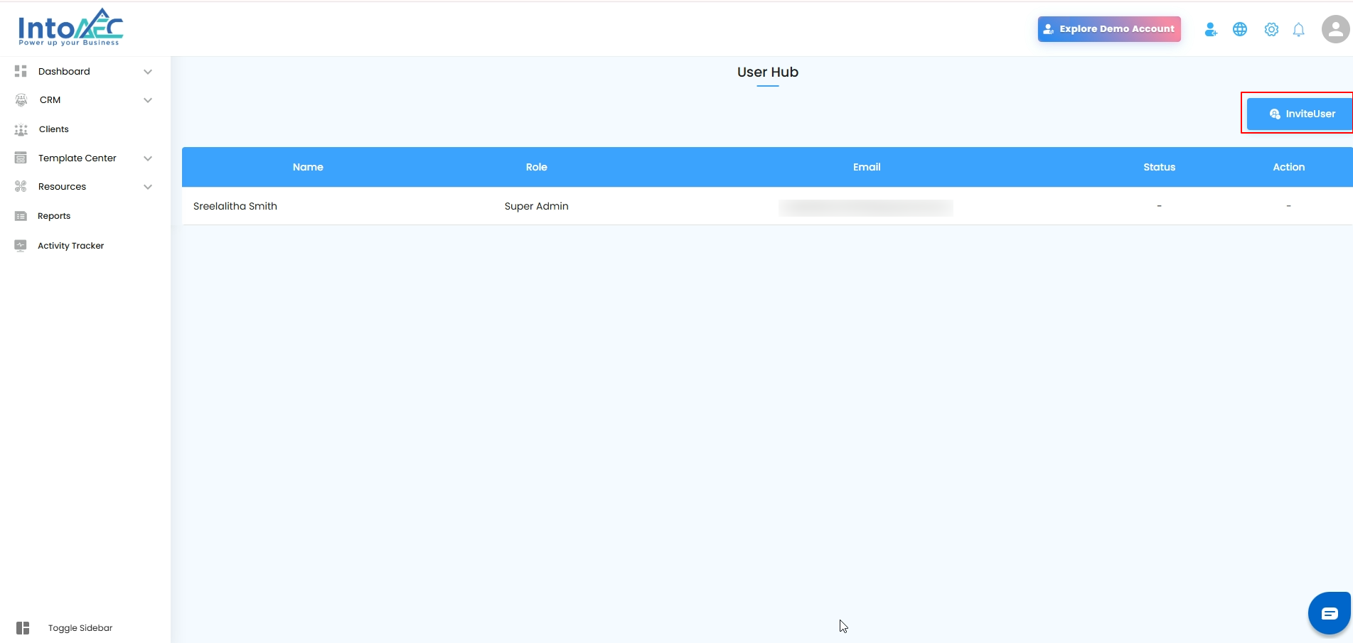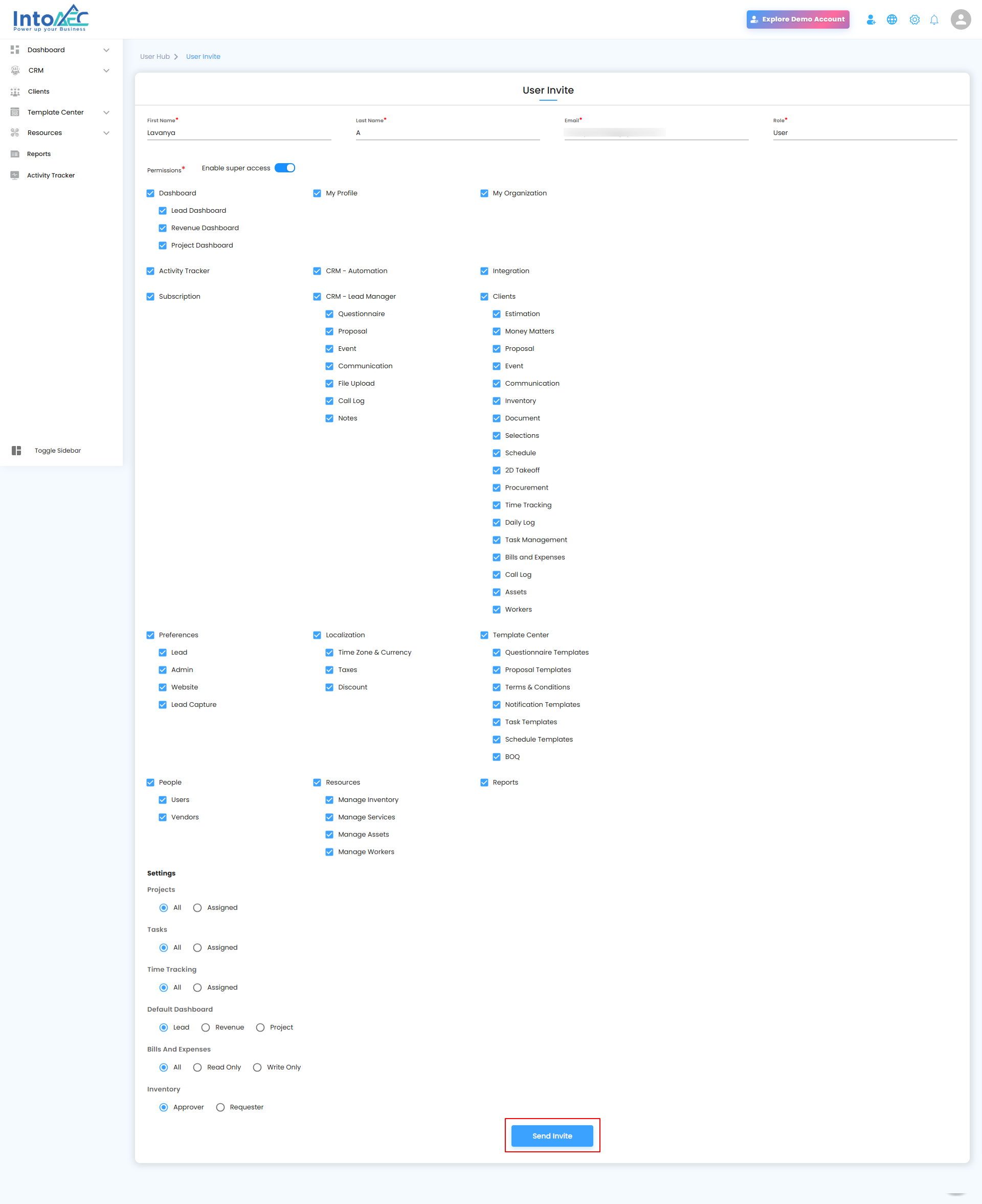 - Click Invite User to start the invitation process.