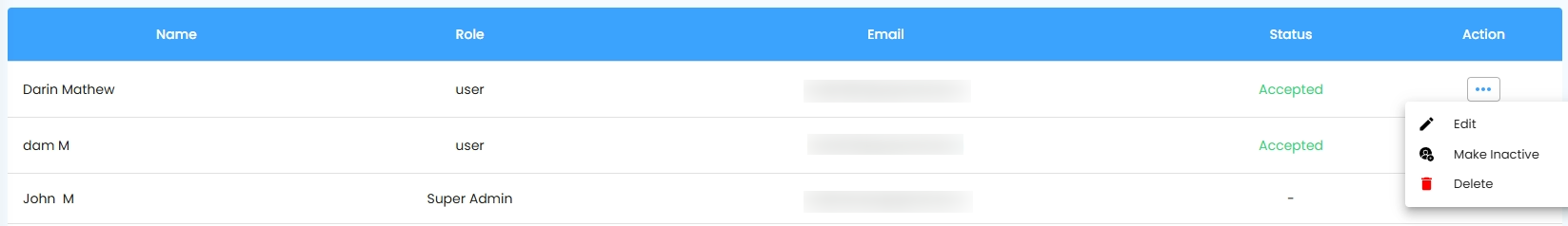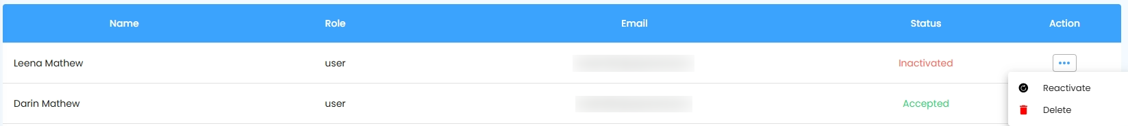 | When user status is Pending | Delete :Super admin/permission provided users only can delete the user. Once the user deleted, the deleted users will not have the access to the specific admin portal login. |