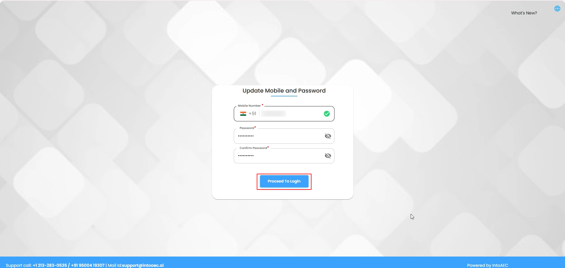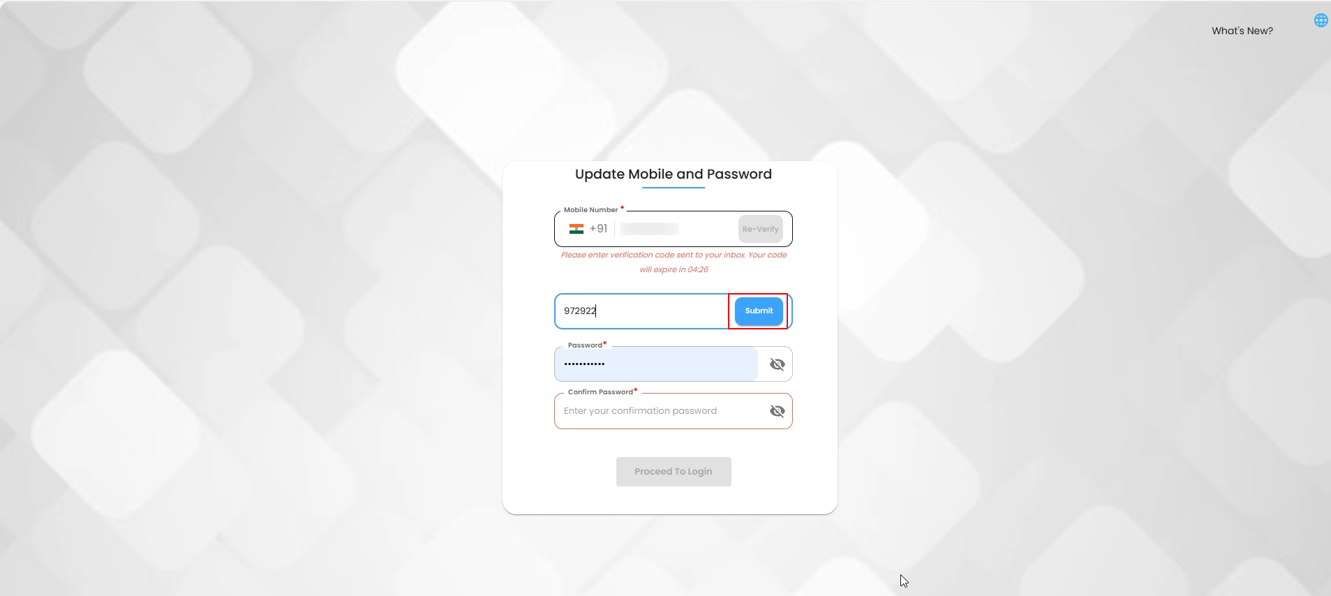- The user sets a password after OTP verification and click on proceed to login.