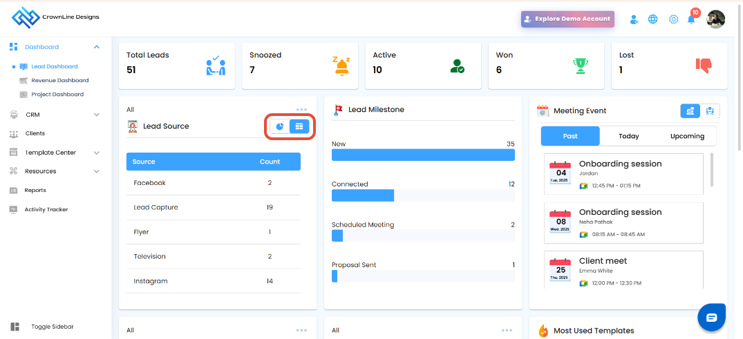The Lead Dashboard page will open, giving you real-time visibility into your lead pipeline, milestones, sources, meetings, and user activities.