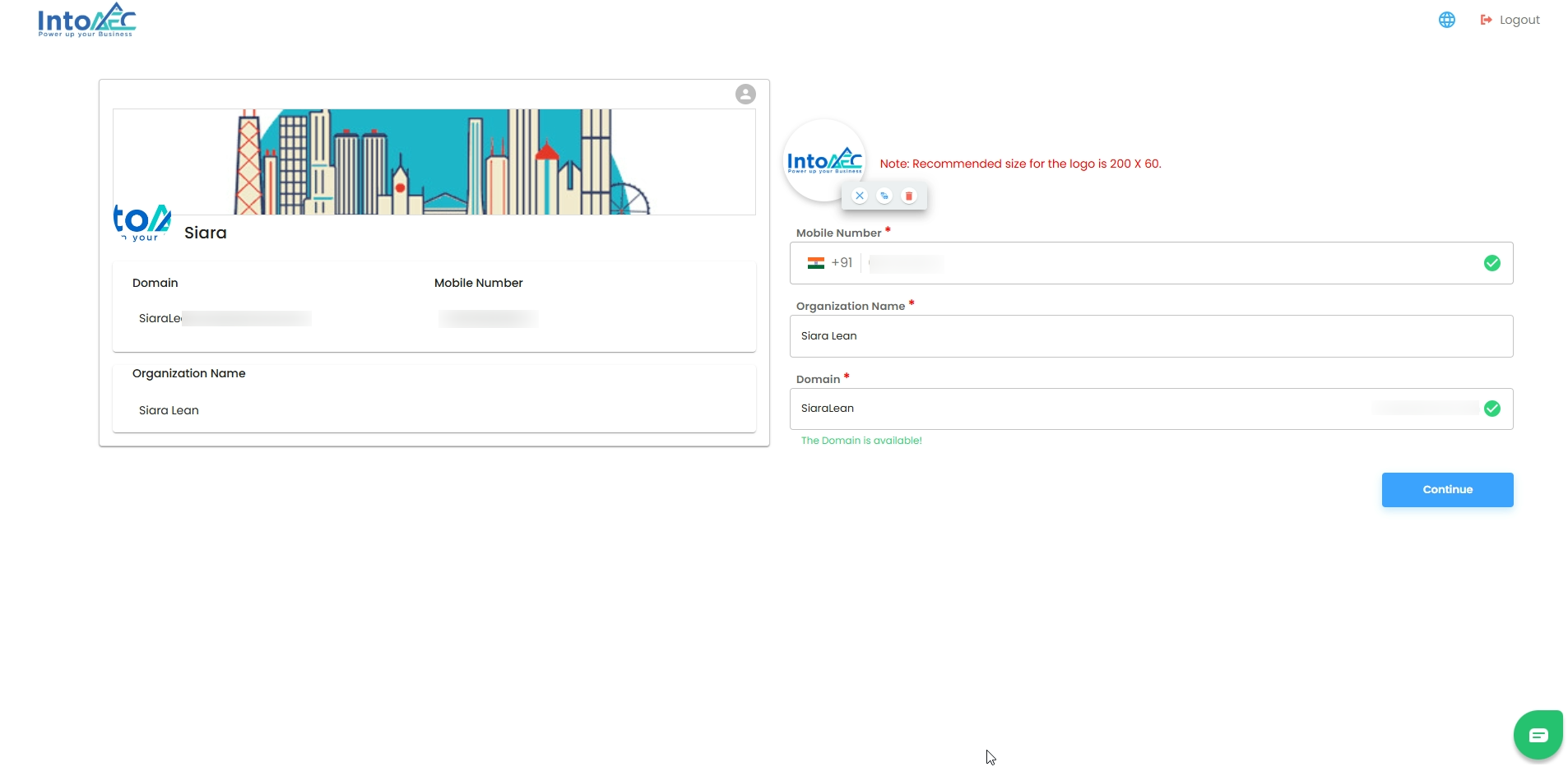 Once you signed up, you’ll be redirected to the Onboarding Page, where some of your details—like your organization name, domain, and mobile number—are automatically filled in based on your signup information.