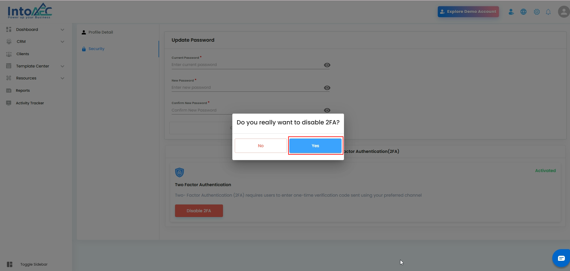 “Are you sure you want to disable Two-Factor Authentication?”Click Yesto proceed.