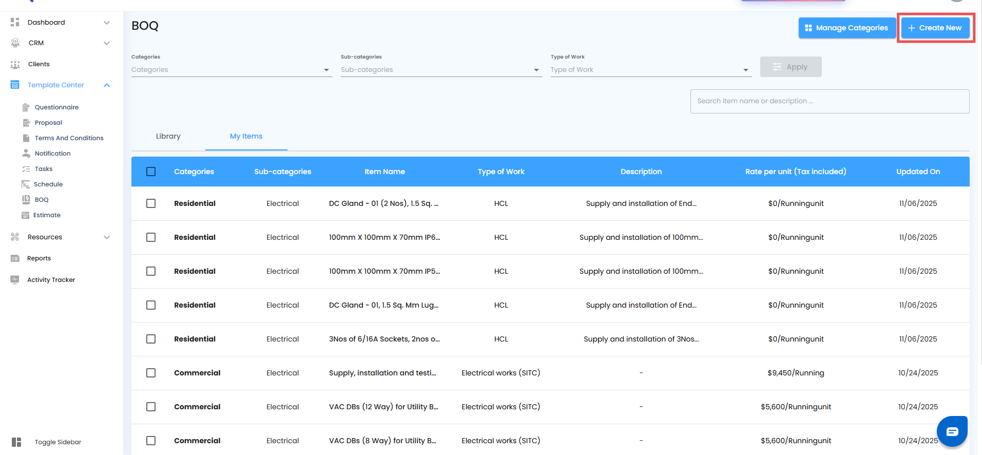 Adding new items to your list ensures your BoQ stays comprehensive and aligned with your project needs. Follow these simple steps to create an item quickly and efficiently.