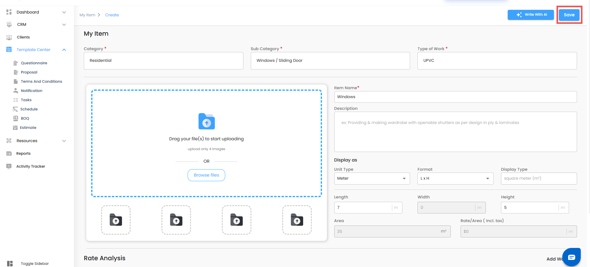 - Save the Item – Click the Save button to finalize and add the item to your BoQ.