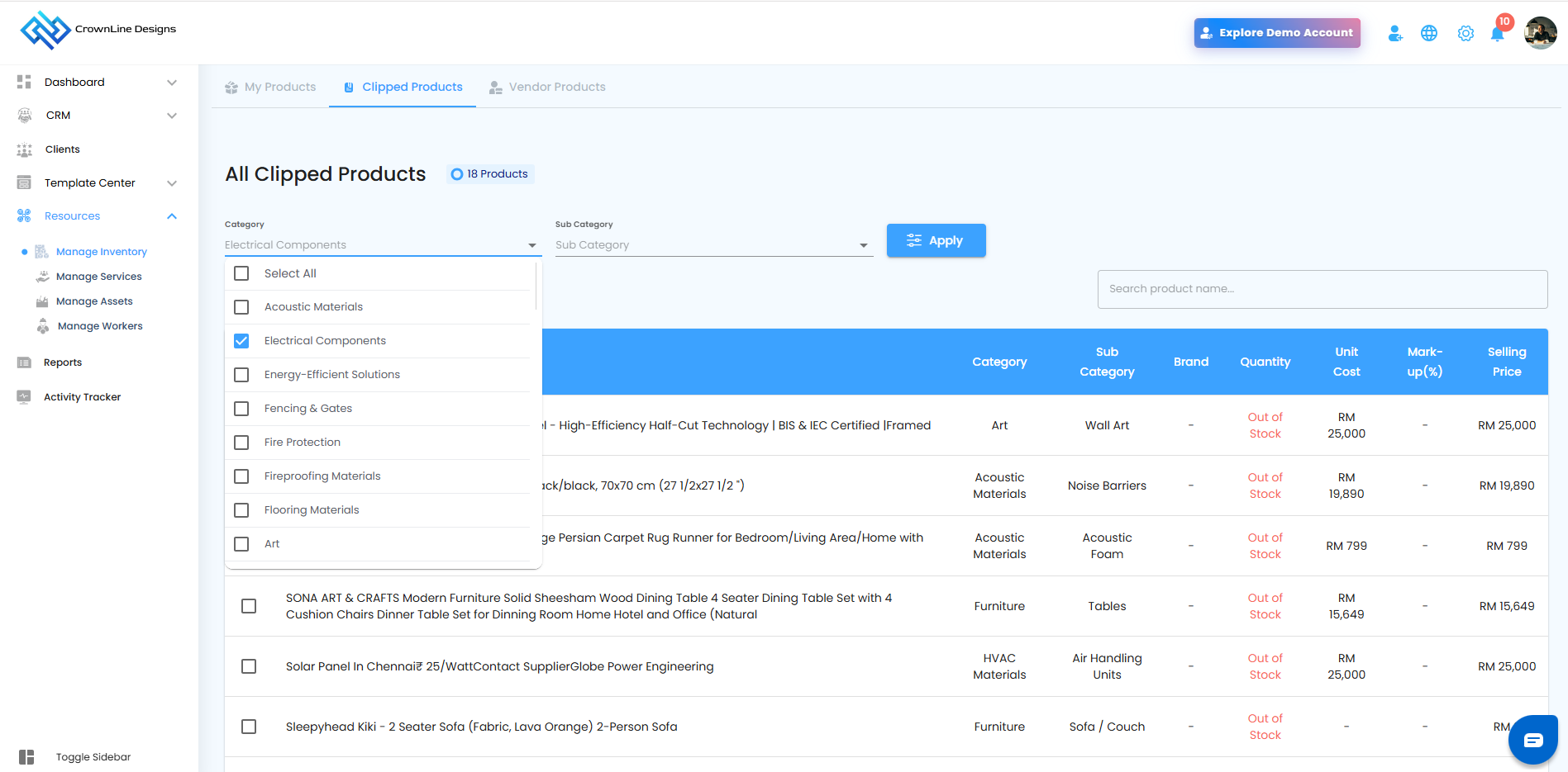 Once your products are clipped and saved, they become instantly reusable across the platform. No need to re-enter the same product details again and again. When you're building an Estimate, adding BOQ Items, or creating an Estimate Template, simply open the Product/Service off-canvas and select Clipped Products from the dropdown. You’ll see all your previously clipped products listed in one place—just pick the items you need and add them directly. This keeps your workflow fast and consistent, ensures accuracy in product information, and helps you build estimates more efficiently with pre-defined materials ready at your fingertips