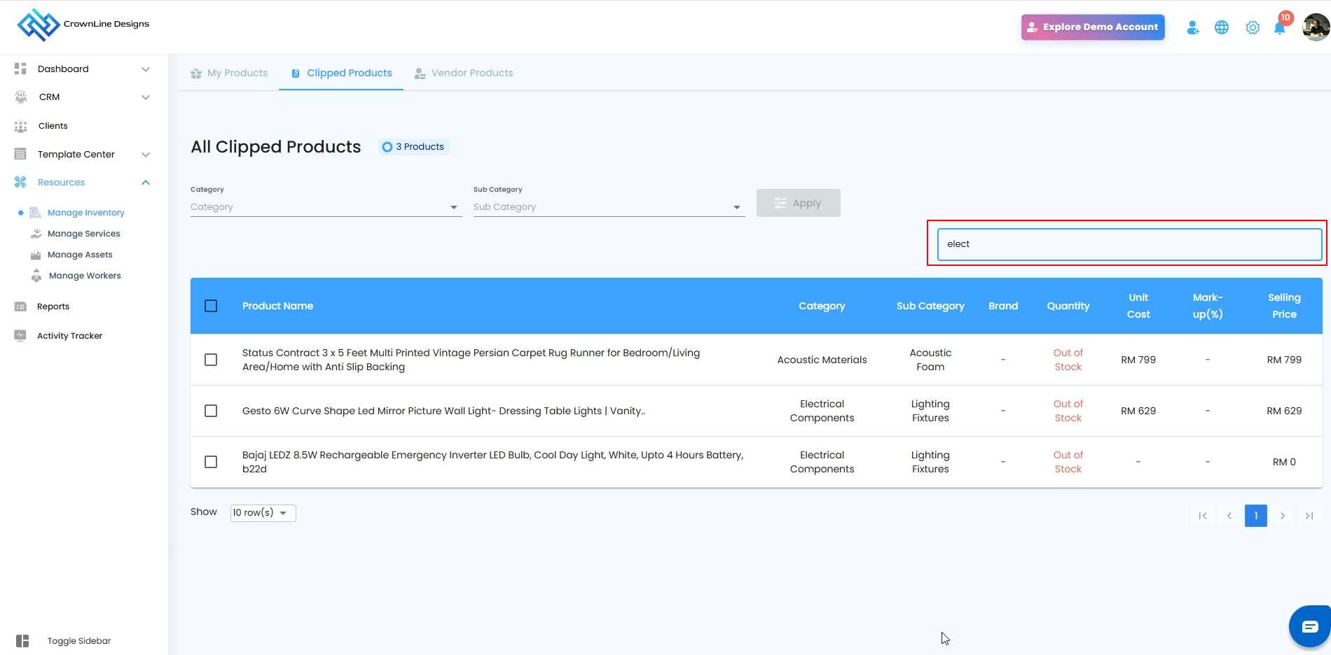 The Clipped Products section allows you to quickly find and manage products using category filters or the search bar. Here’s how you can refine your product list for faster access: