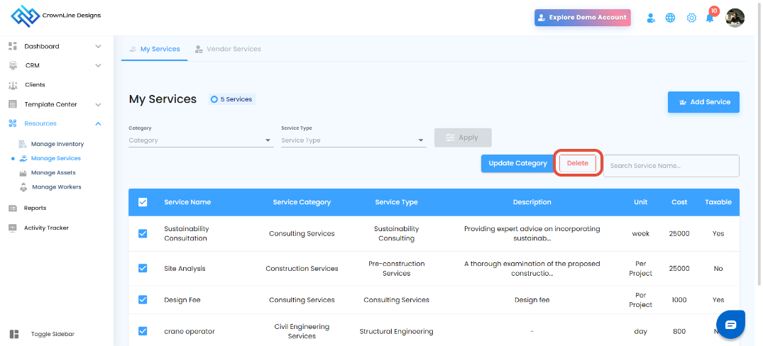 - Find the service you wish to remove and click the "Delete" option next to it.