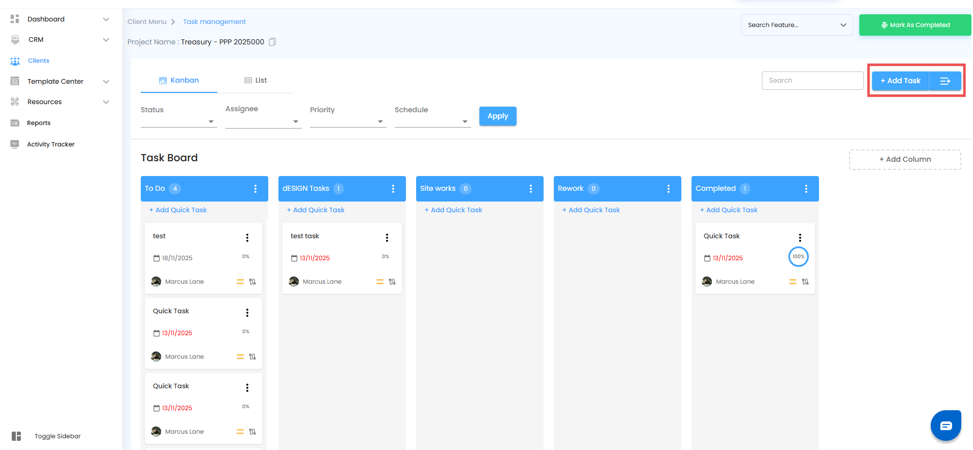 - Once saved, the task automatically appears in the whichever column status you’ve set as your default.