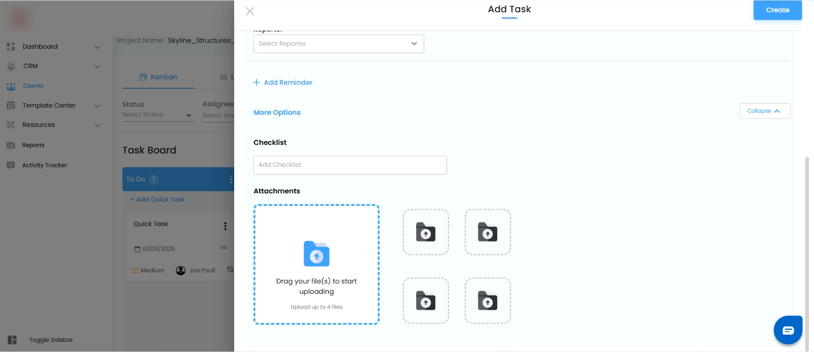 Attach drawings, contracts, images, or reference docs directly to the task.
