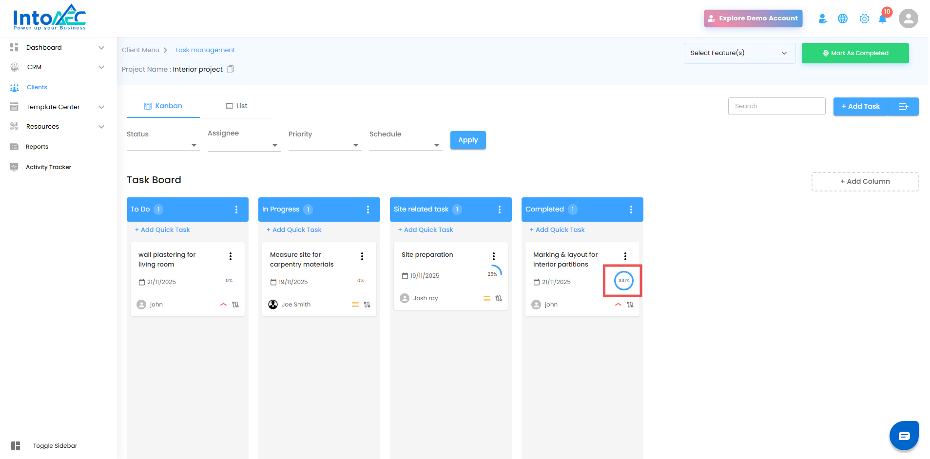 Every task card comes alive with progress indicators so you know exactly how things are moving: