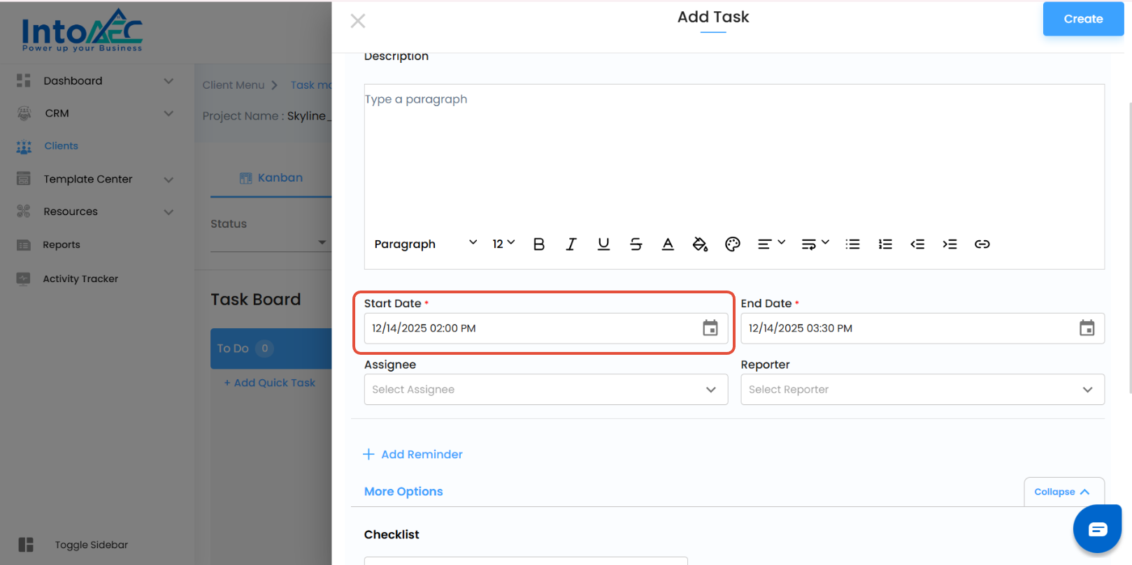 Defines the exact date and time when a task is scheduled to begin. This helps teams clearly understand when work should start and plan their activities accordingly.End Date and time– The deadline or target completion date.
