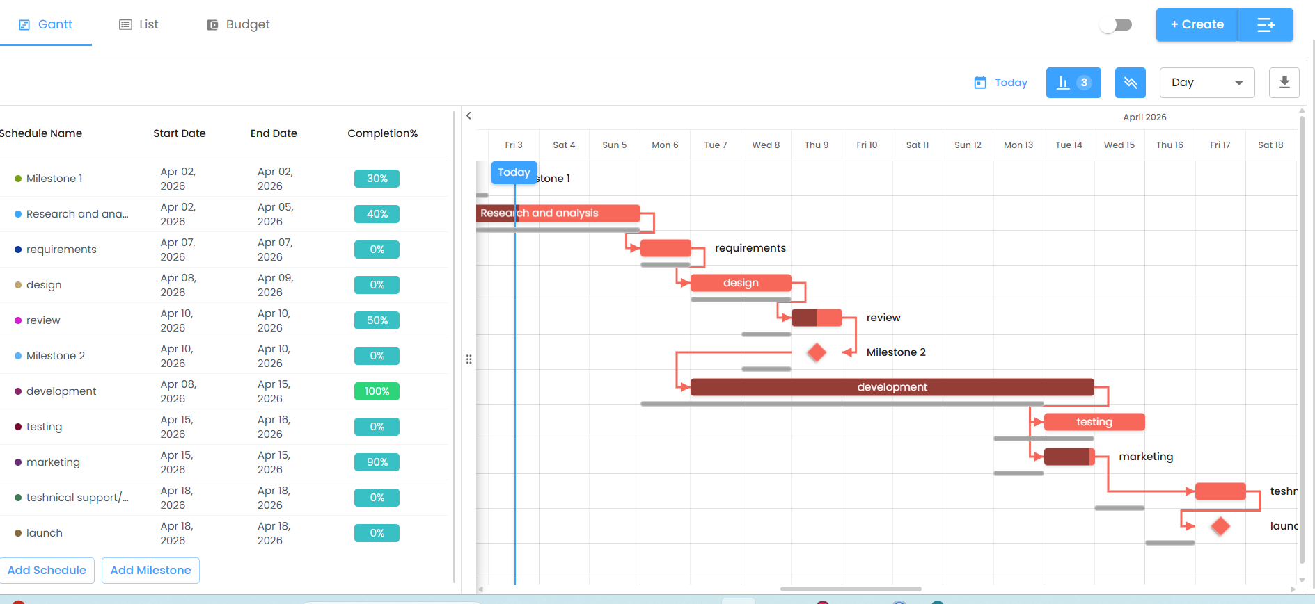 Organize your project into clear, manageable blocks by clicking Add Schedule. Set a name, timeline, and duration for each schedule to keep phases structured and easy to track.