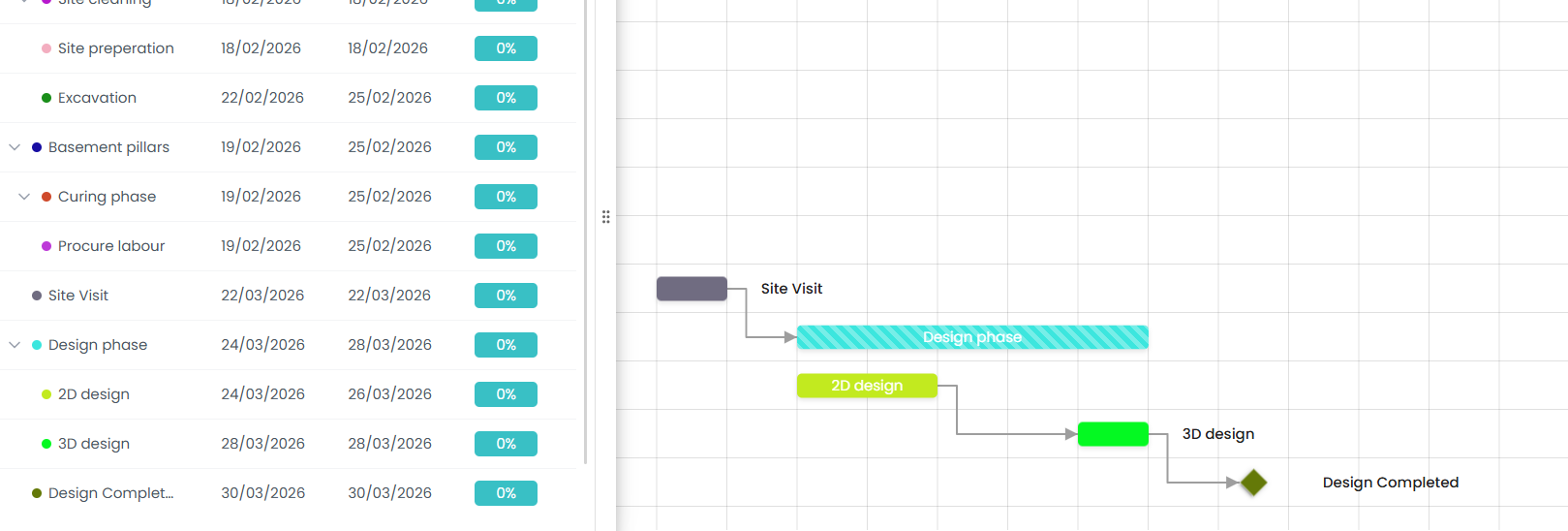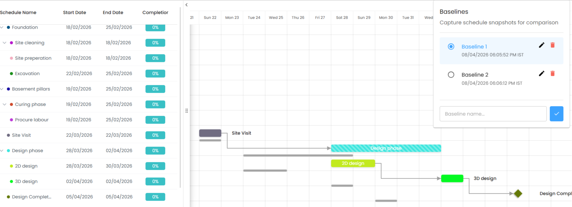 To create a baseline, go to the scheduling view and click on the Baseline option available at the top corner of the screen, then enter a suitable name to identify that version of the schedule (for example, “Initial Plan” or “Phase 1 Plan”) and save it. Once the baseline is created, you can continue updating your schedule—such as modifying task dates, adding dependencies, or adjusting timelines—without losing the original plan.When you want to review or compare changes, you can open any saved baseline, which will overlay the previous schedule onto your current one. As shown in the screenshot, the earlier planned schedule is displayed as gray lines across the timeline, while your current schedule remains in color. This visual comparison makes it easy to identify delays, shifts, or improvements in your project execution by showing exactly where tasks were originally planned versus where they are now. Baselines are especially useful for project tracking, reporting, and accountability, as they provide a clear historical record of planning changes and help teams stay aligned with project goals.