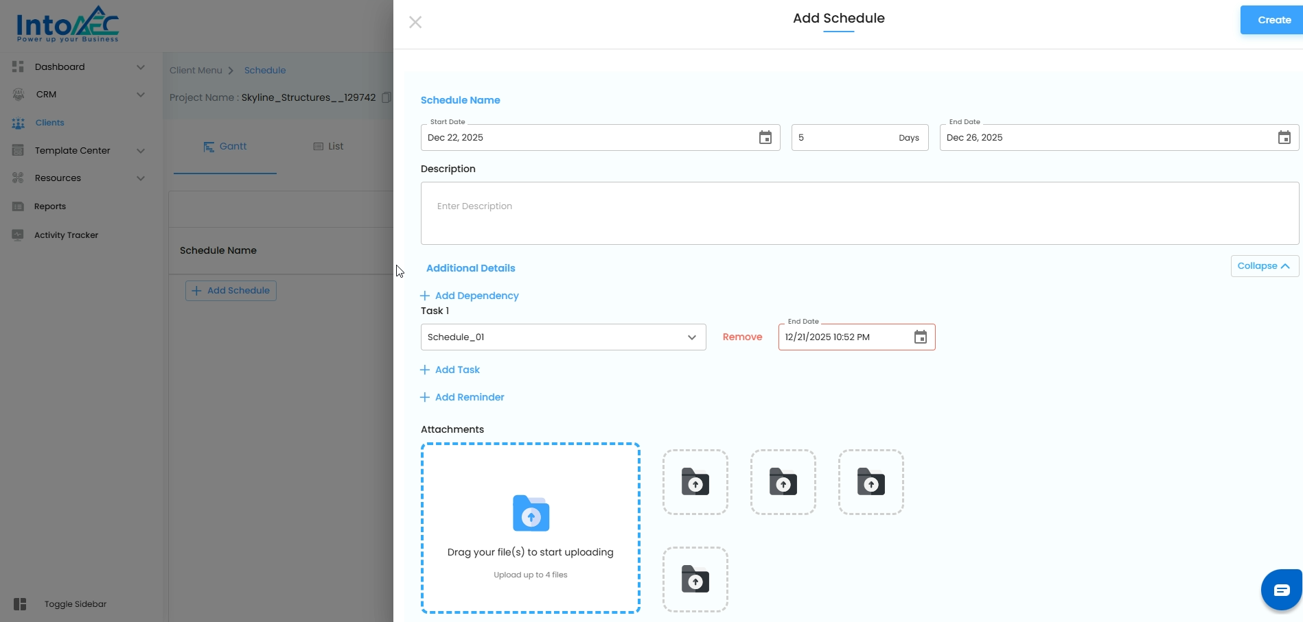 Creating a schedule in IntoAEC allows you to organize your project into manageable blocks, assign timelines, and track progress effectively. Follow these steps to set up a new schedule: