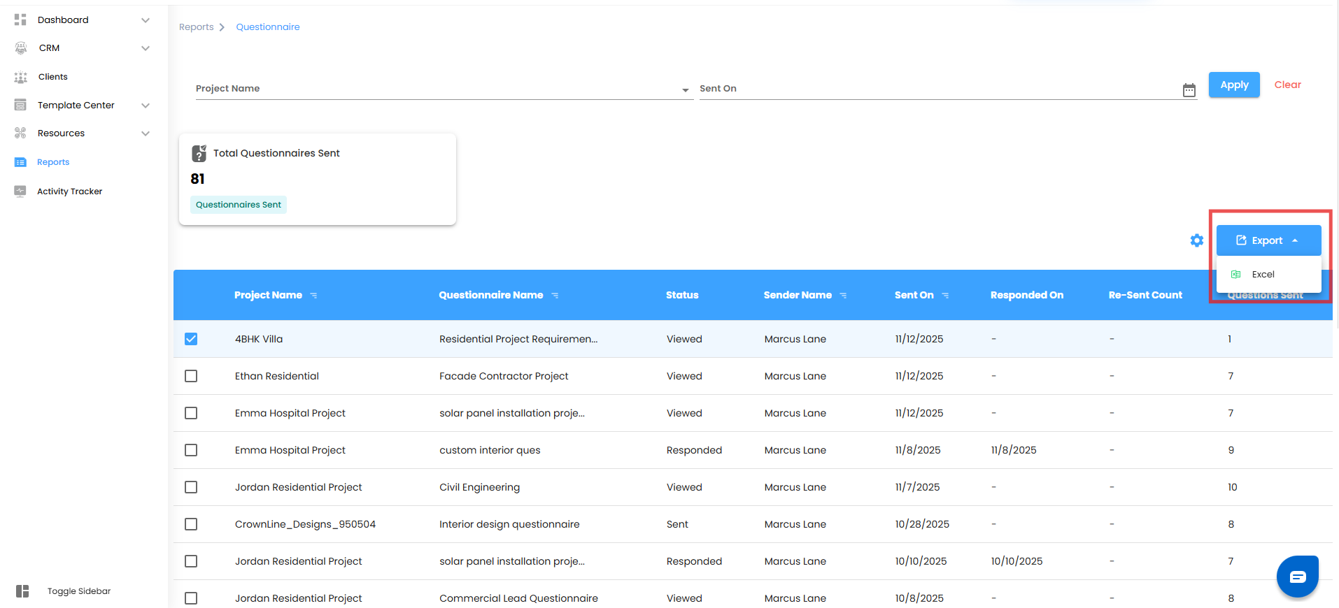 Click Export to download questionnaire details in Excel format for offline review or deeper analysis.