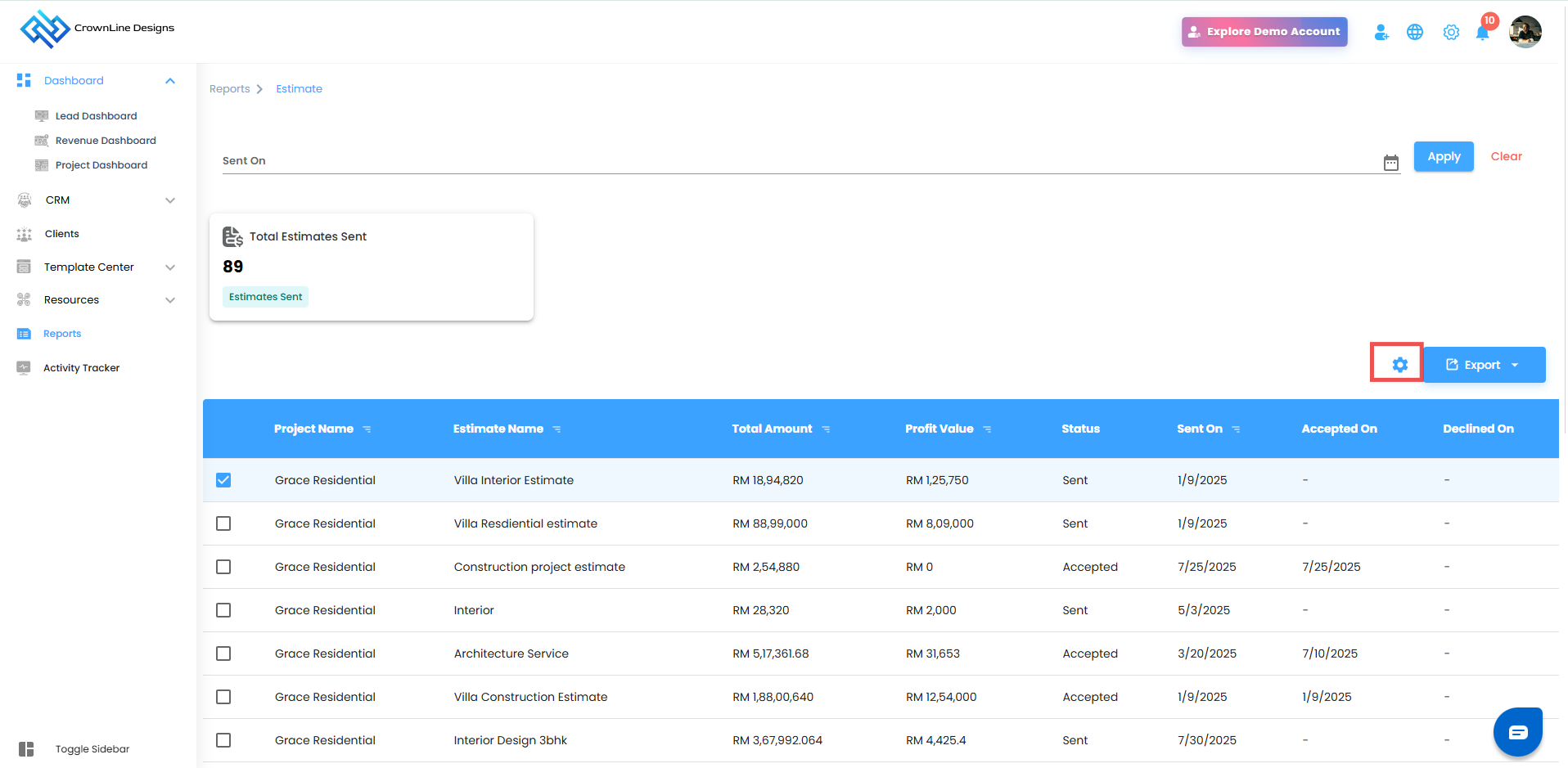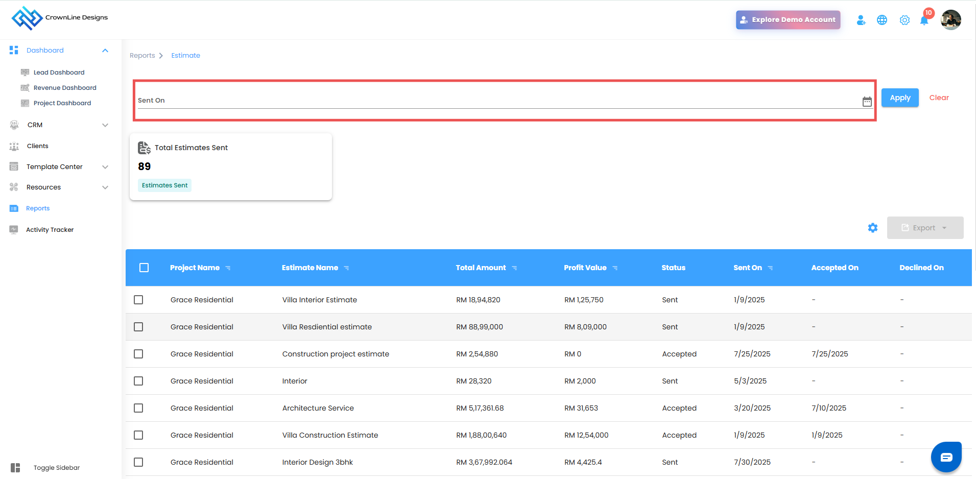 Think of the Estimate Report as your project’s crystal ball for finances—showing which estimates are sent, accepted, or pending, and giving you a clear view of trends and numbers at a glance.