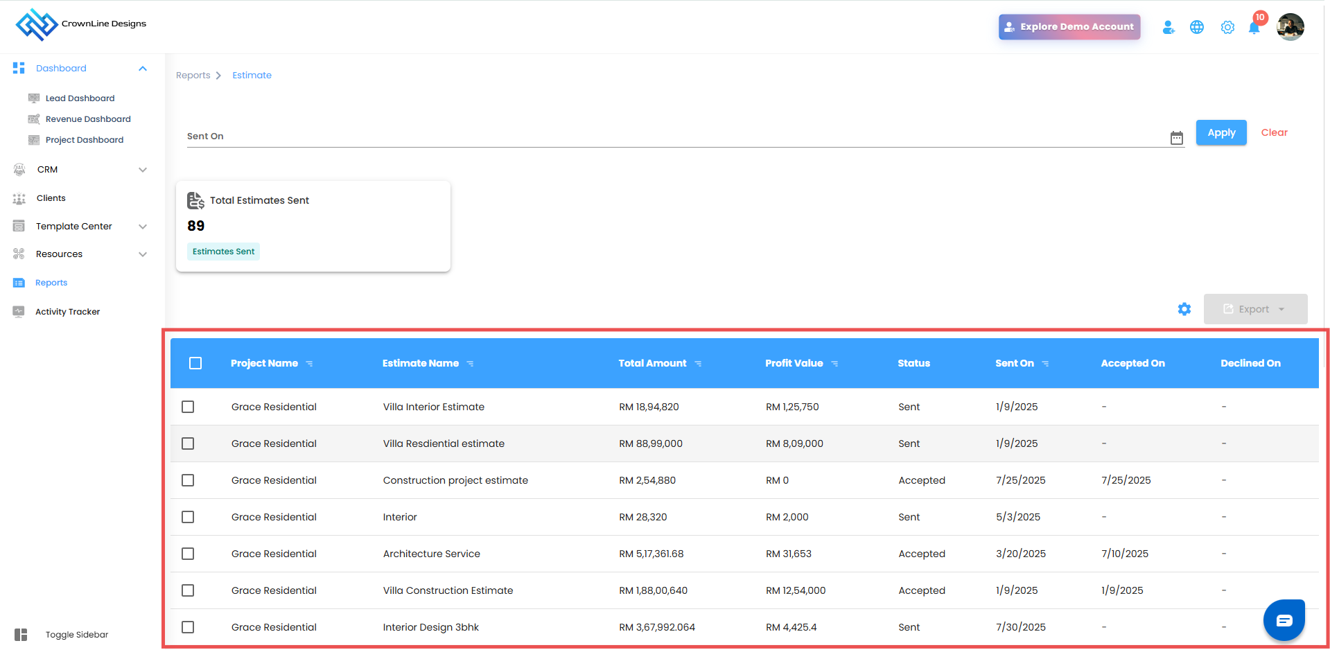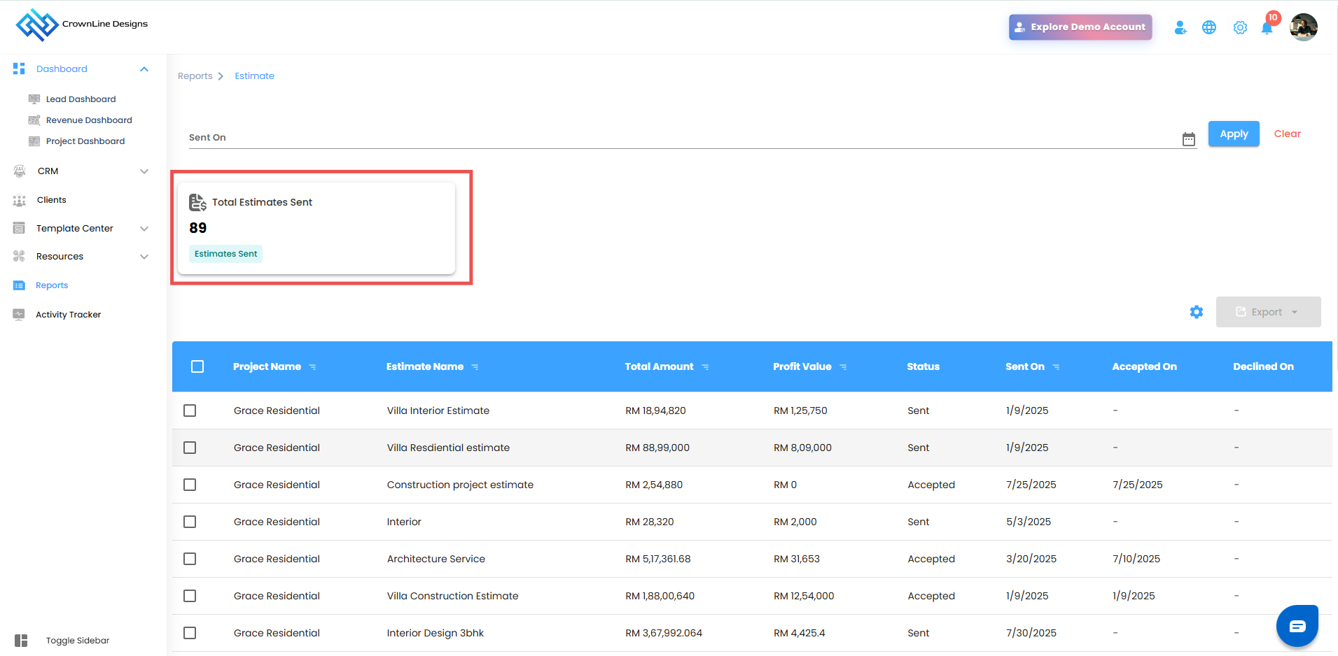 - Total Estimates Sent – See the total number of estimates shared with clients. It’s your quick pulse check on how active your projects are.