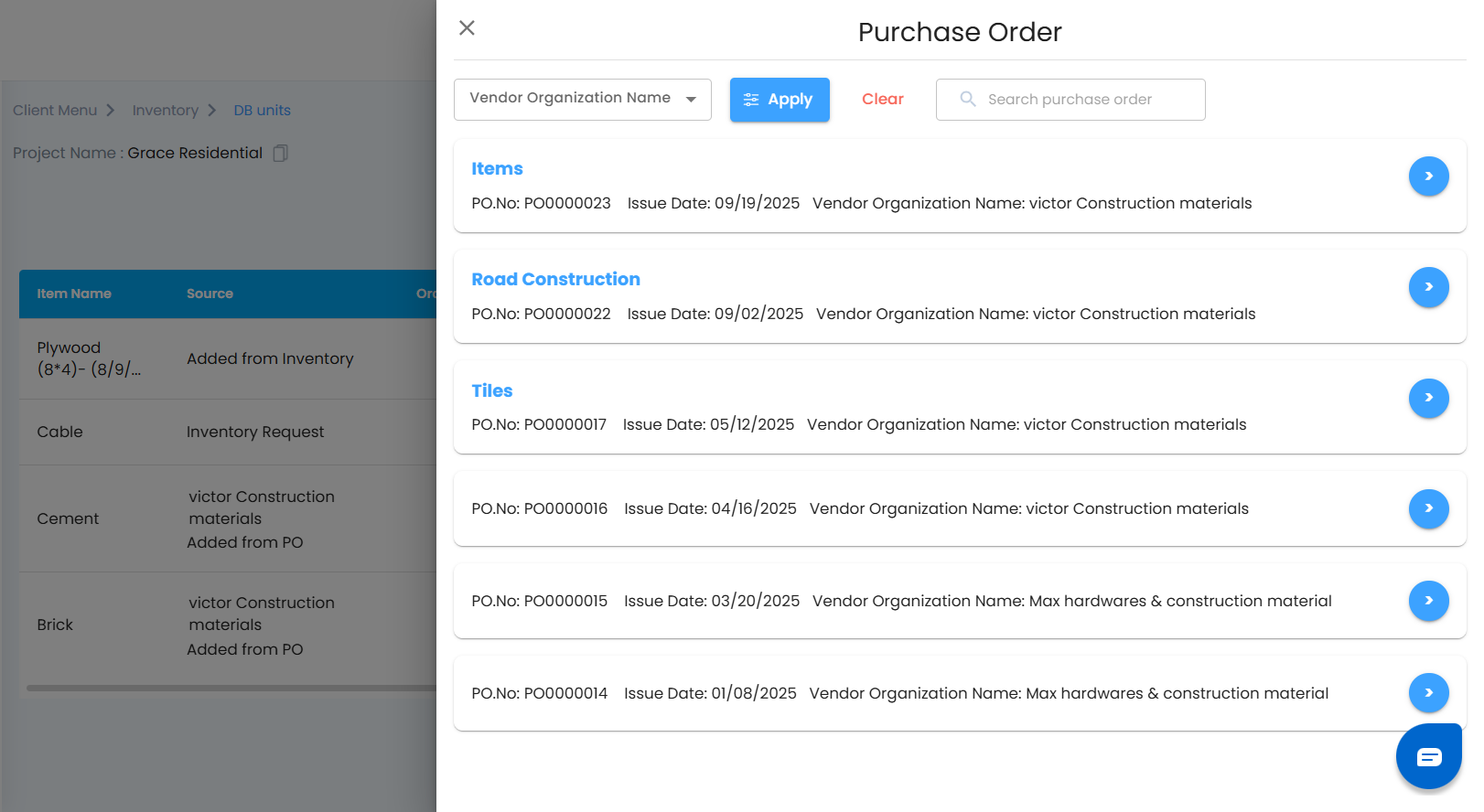 - When you open the PO selection panel, you’ll see a neatly organized list of all available and accepted Purchase Orders.