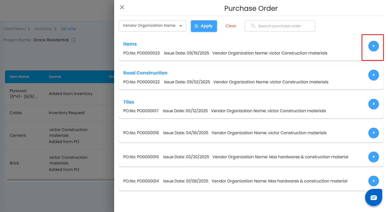 - Click the arrow ( > ) icon next to that PO.