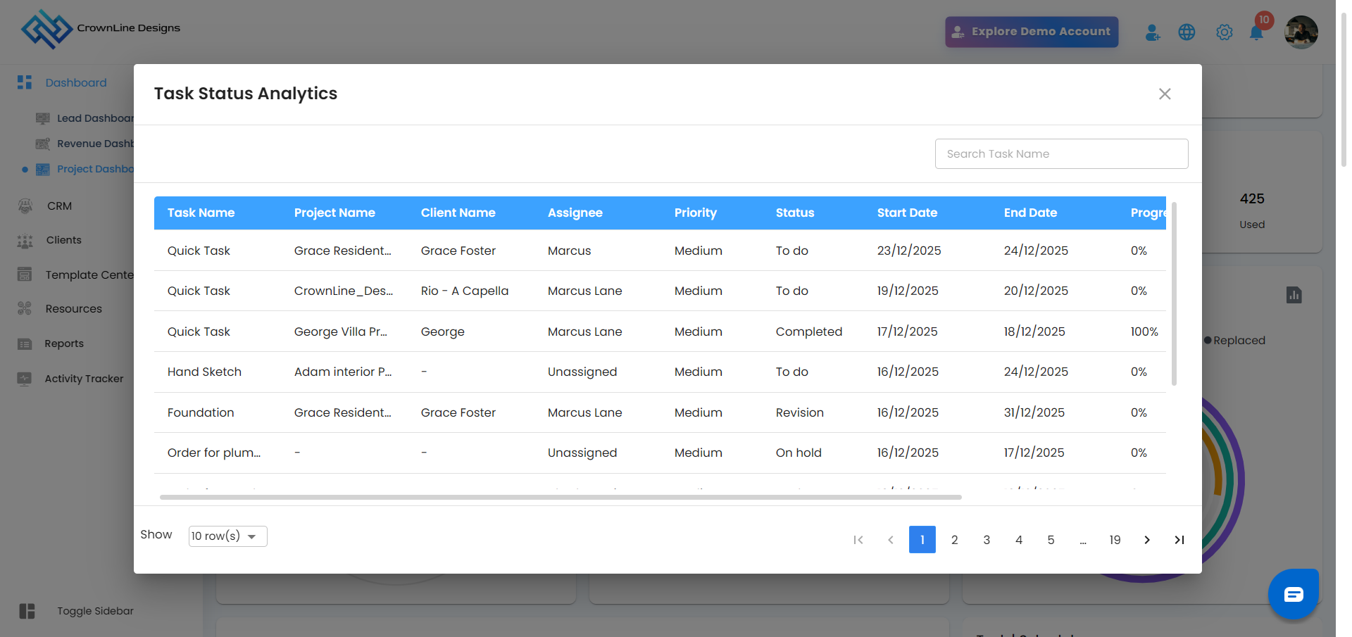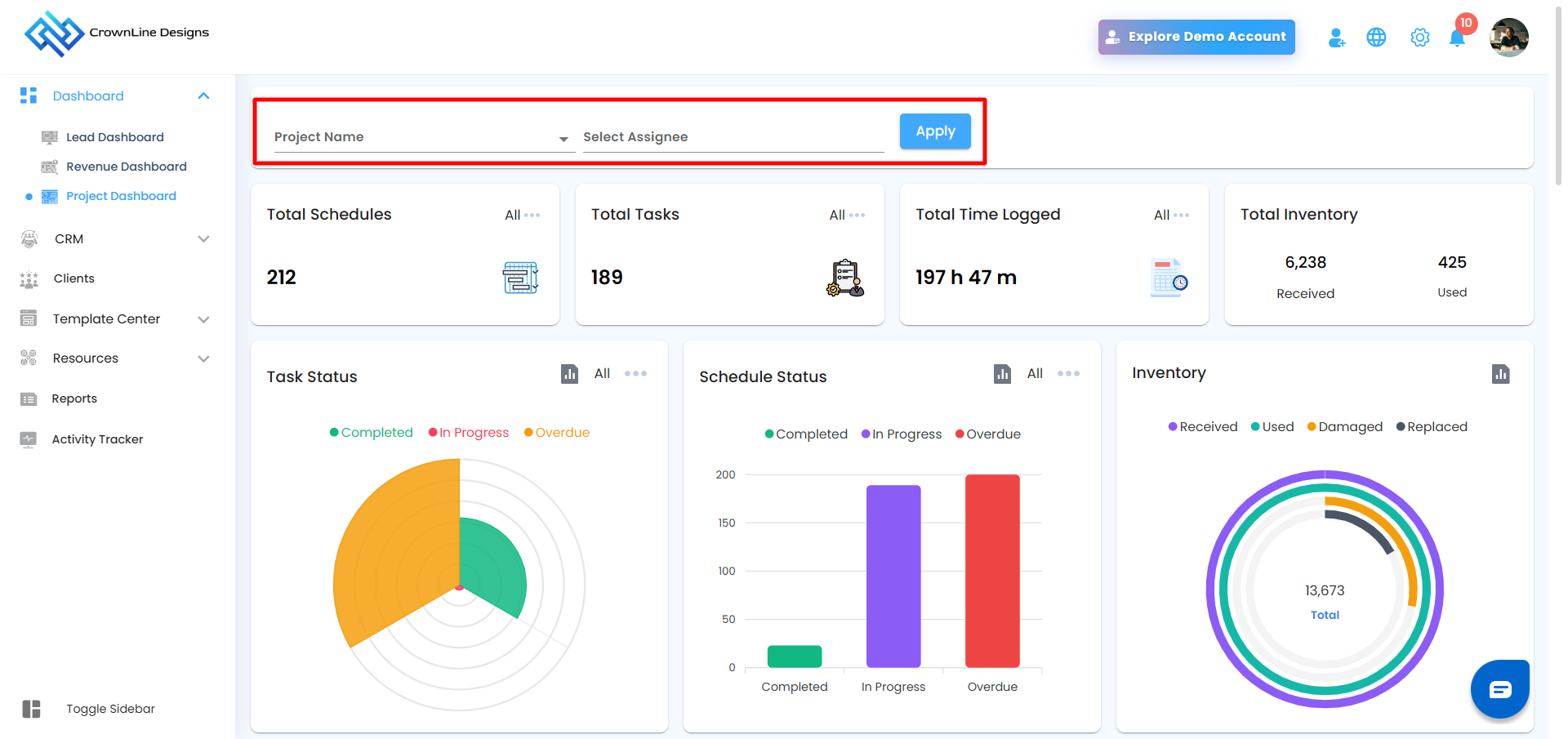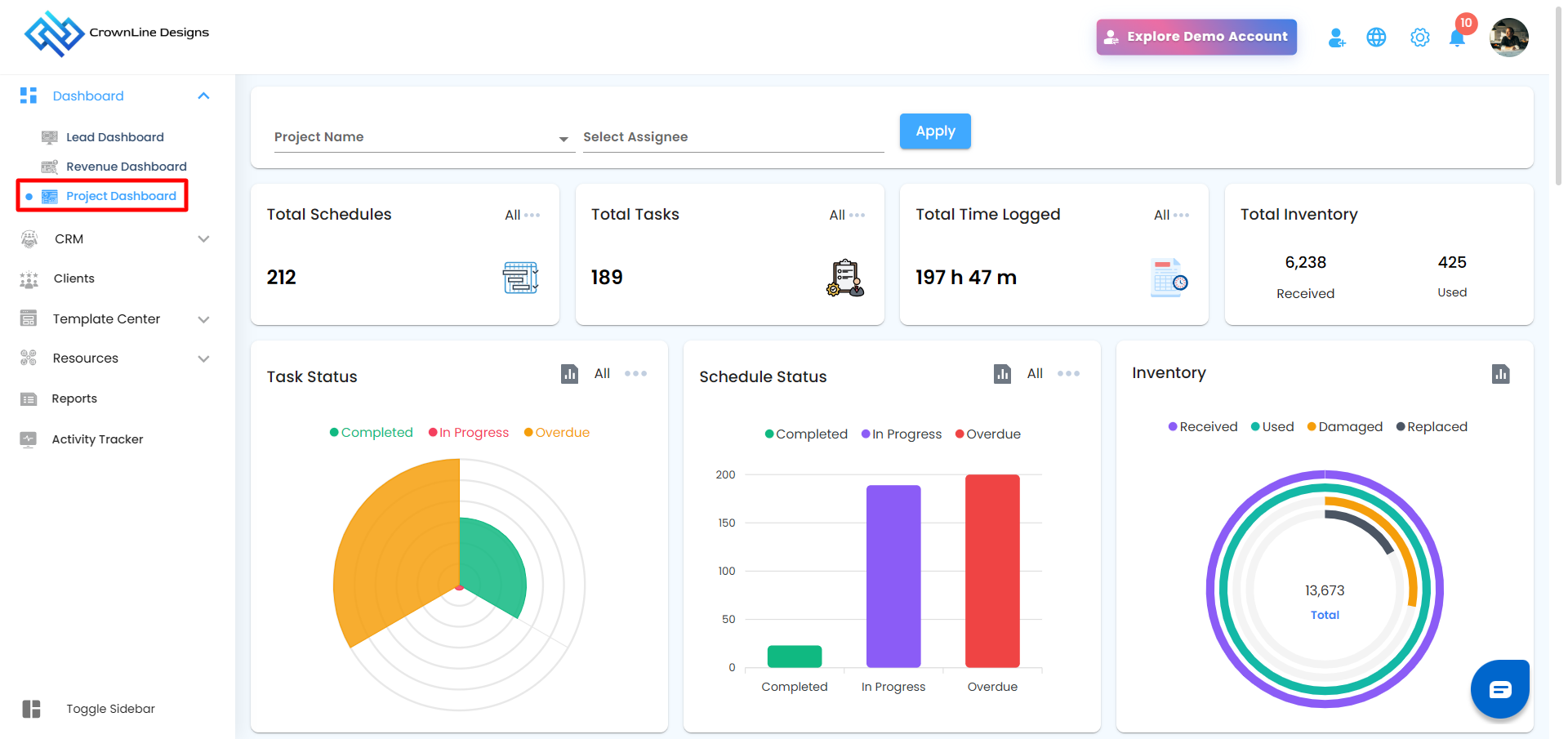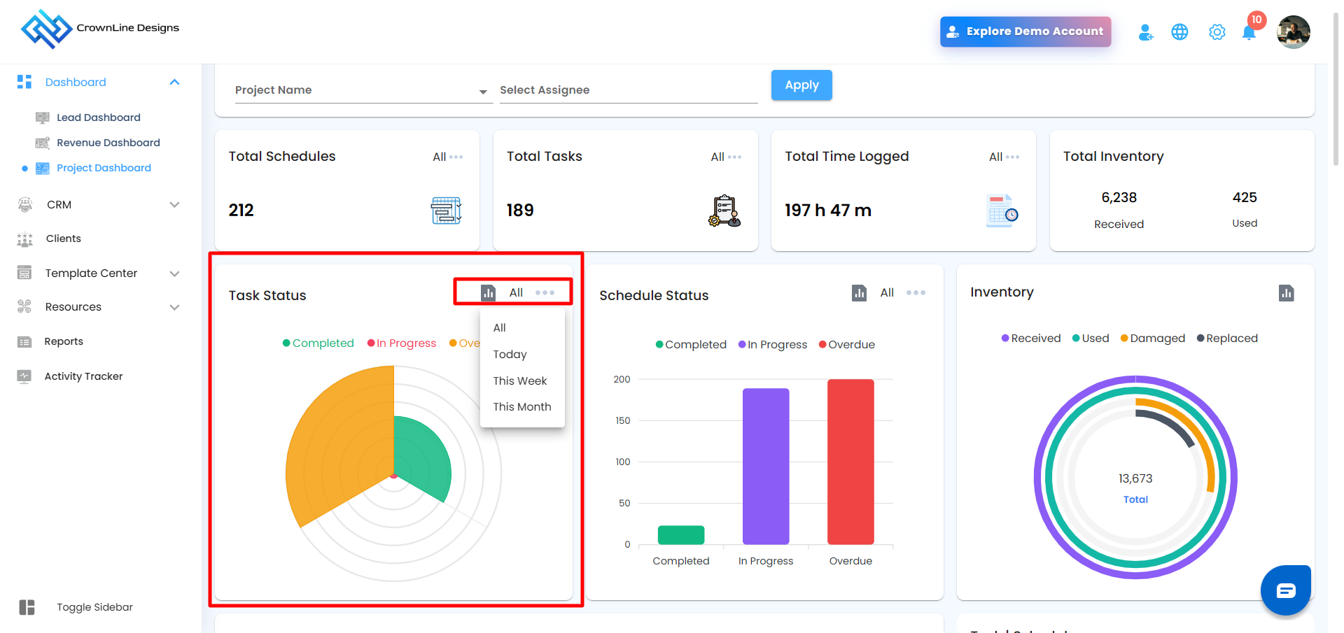 The Task Status Pie Chart provides a clear, visual summary of how tasks are progressing across all projects. It helps you quickly assess overall task health and identify areas that may need attention
